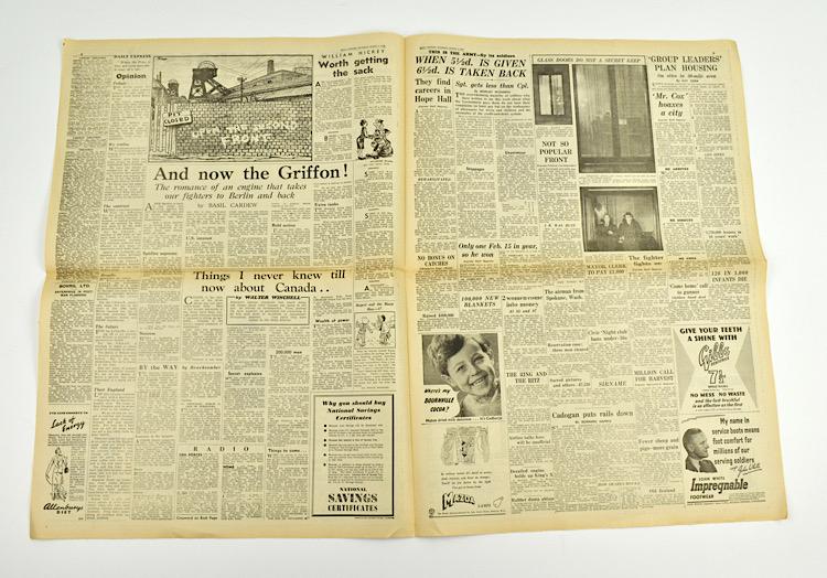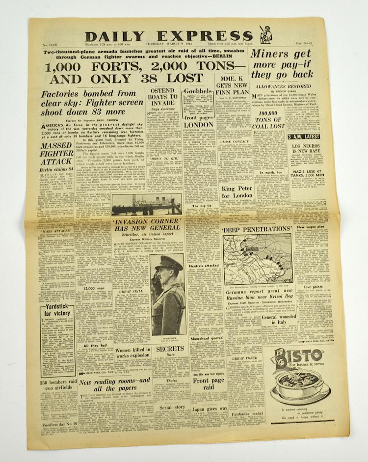 British WW2 Daily Express Newspaper Dated “March 9, 1944” nice decorative British WW2 newspaper. Headline news! “1000 Forts, 2000 Tons and only 38 Lost” In very good condition, great for display!