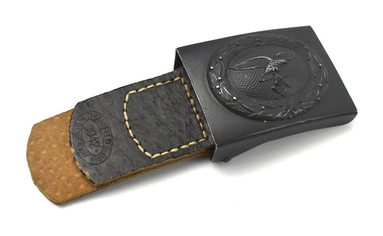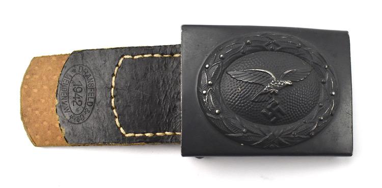 Very nice mint Luftwaffe unmarked steel belt buckle with nice black leather tab, marked “Dransfeld & Co. Menden VW” and dated “1942”