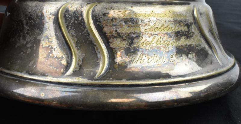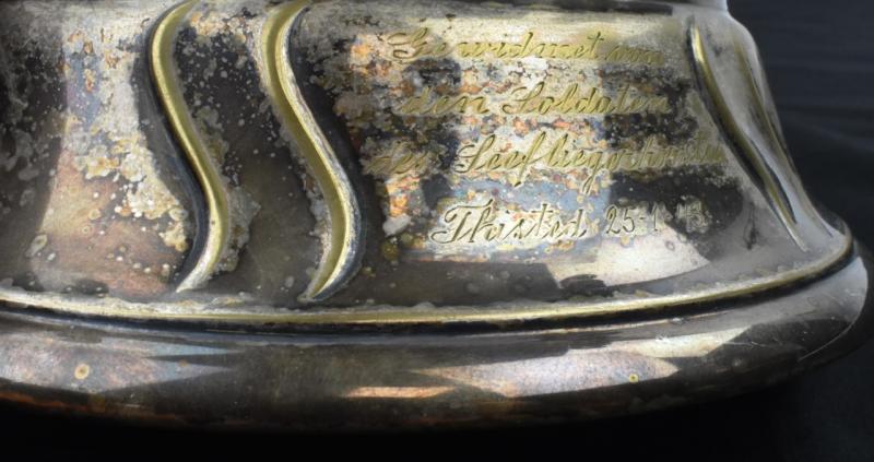 “Gewidmet von den Soldaten des Seefliegerhorstes Thisted 25-1-43” a present from the soldiers of the navel flight base “Thisted” which was a town in Denmark. Overal a nice used bowl in very good condition.