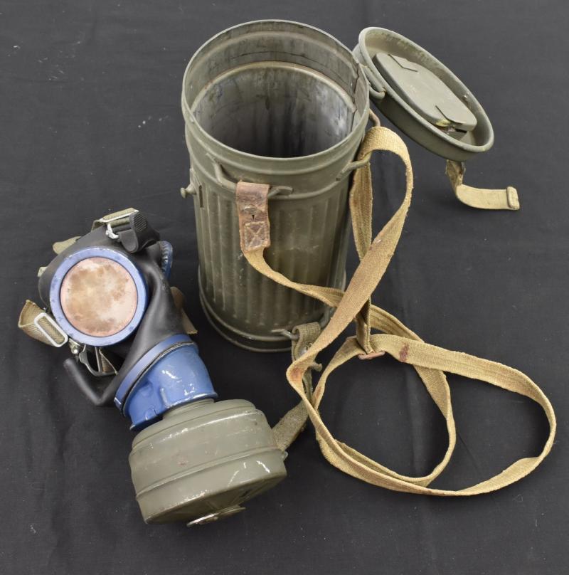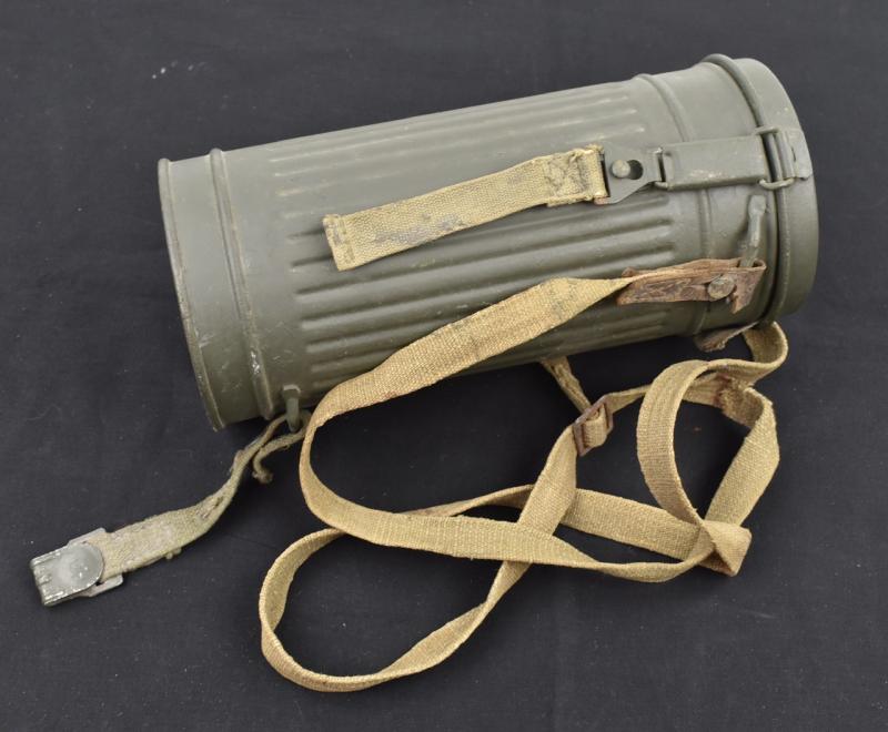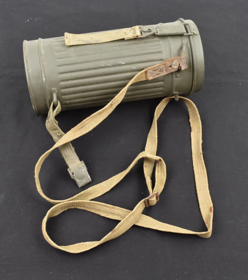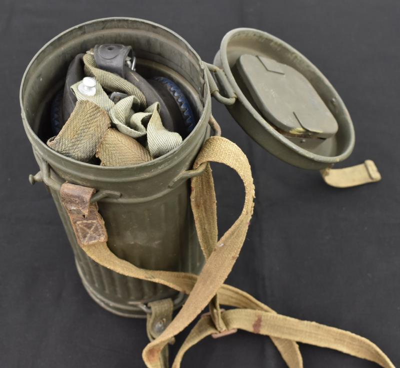 Nice used Wehrmacht M31 gasmask cannister with gasmask, complete with all its original straps.
