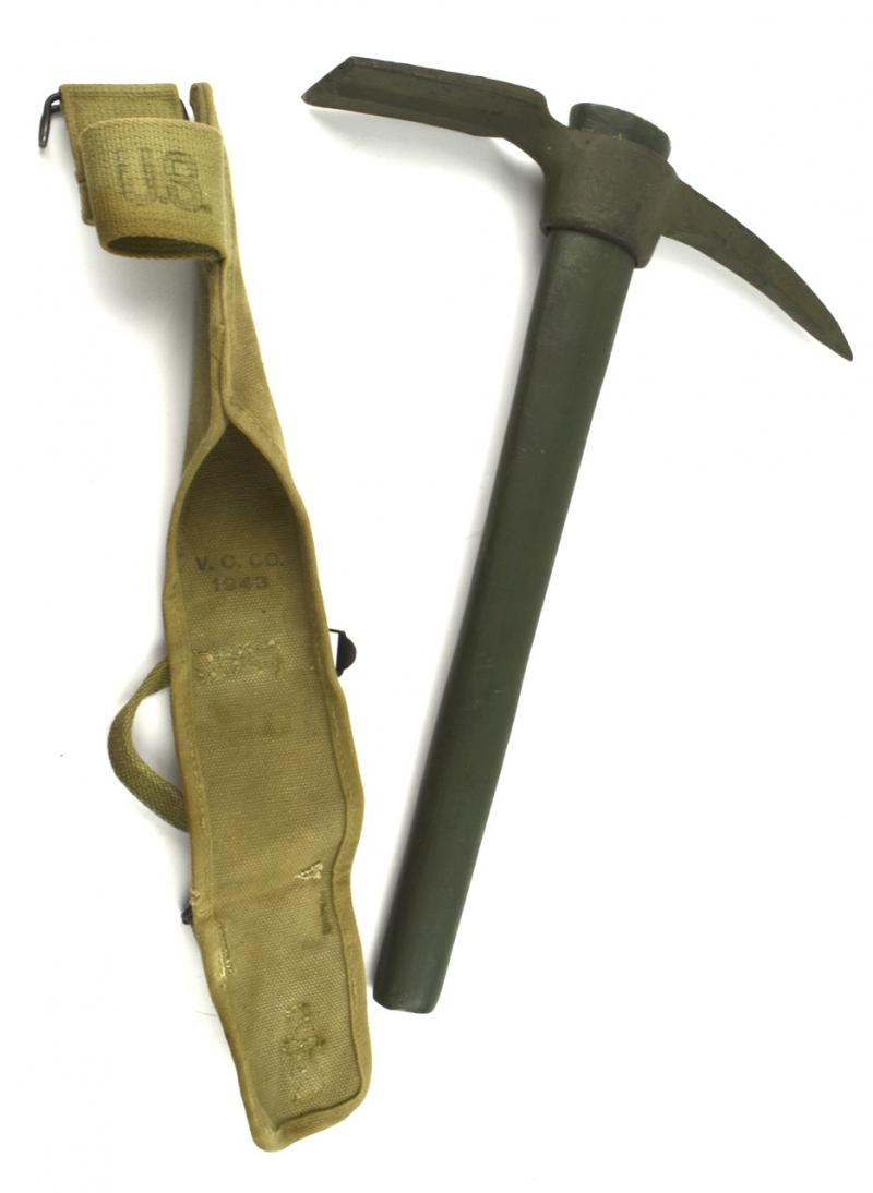 US WW2 Pick Axe/Trench Tool Nice near mint US WW2 pick axe/trench tool in its original cover. Cover marked “V.C.Co” and dated “1943” overal in very good near mint condition. Used by all US WW2 combat soldiers.