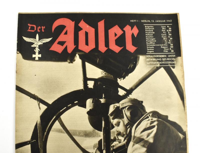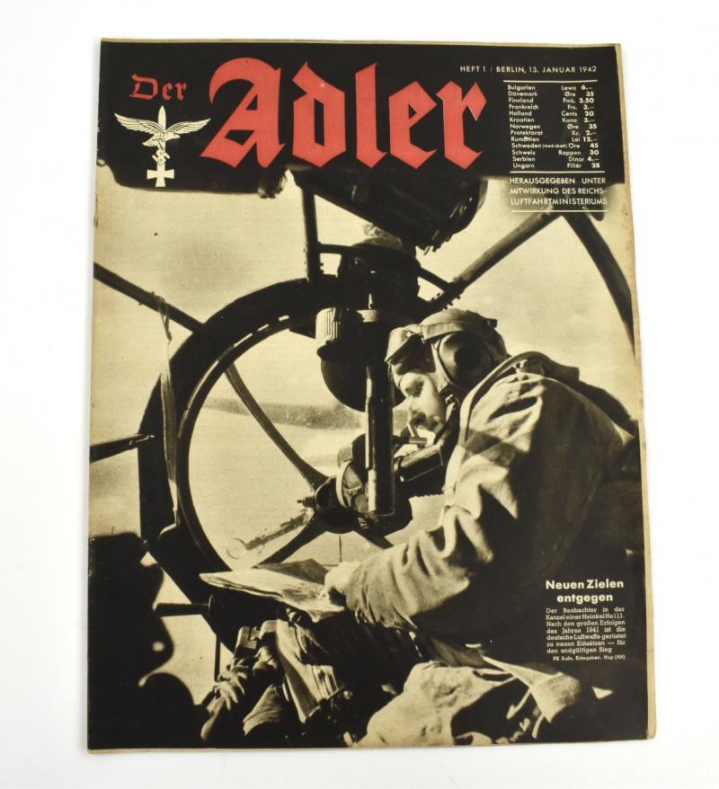 Der Adler Luftwaffe Magazine On the cover “Neuen Zielen entgegen, Der Beobachter in der Kanzel ein Henkel 111” Dated “January 13, 1942” With lots a nice photographs inside. In very good condition.