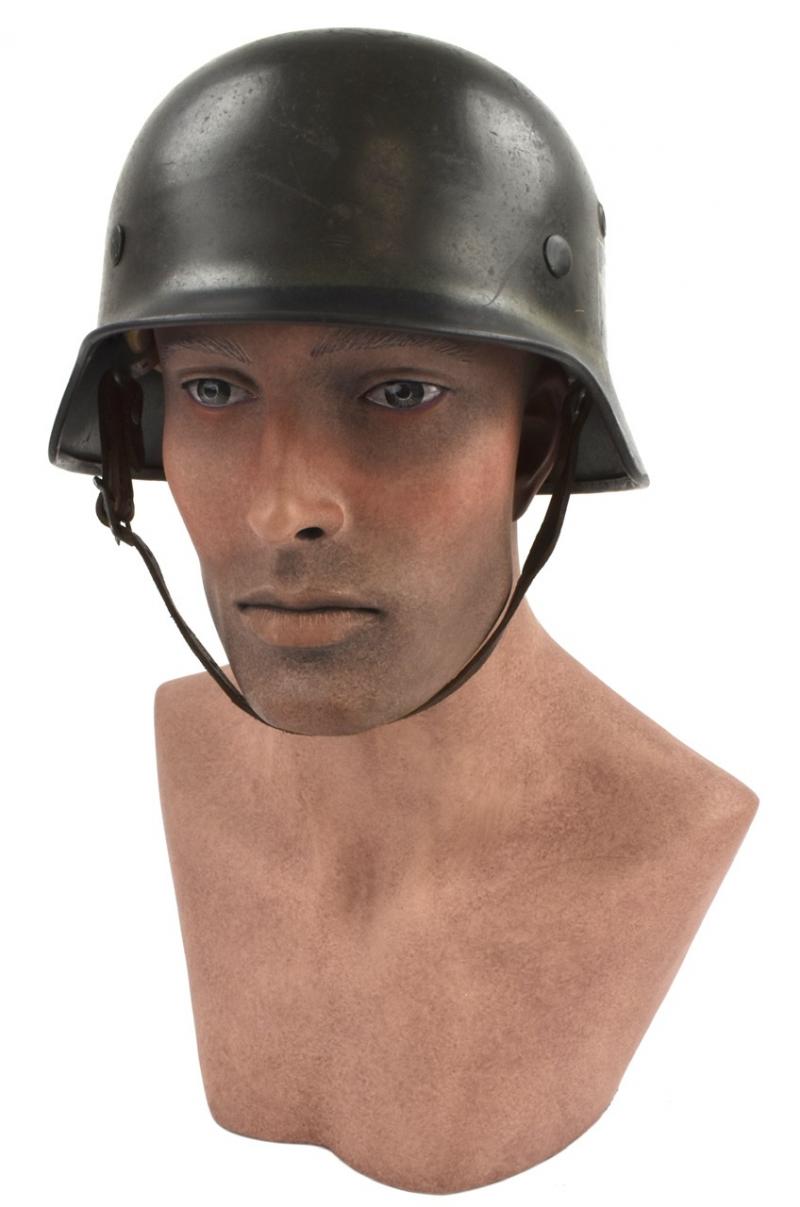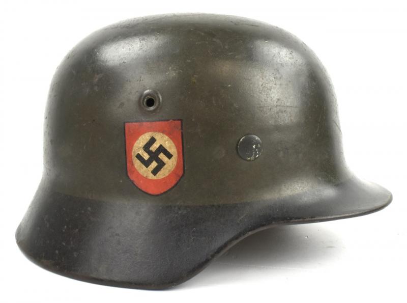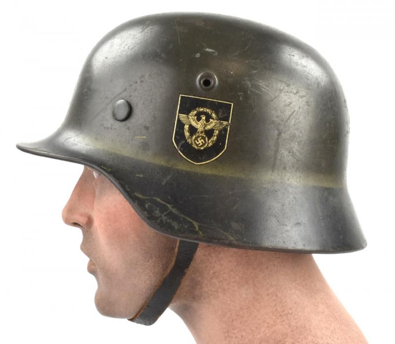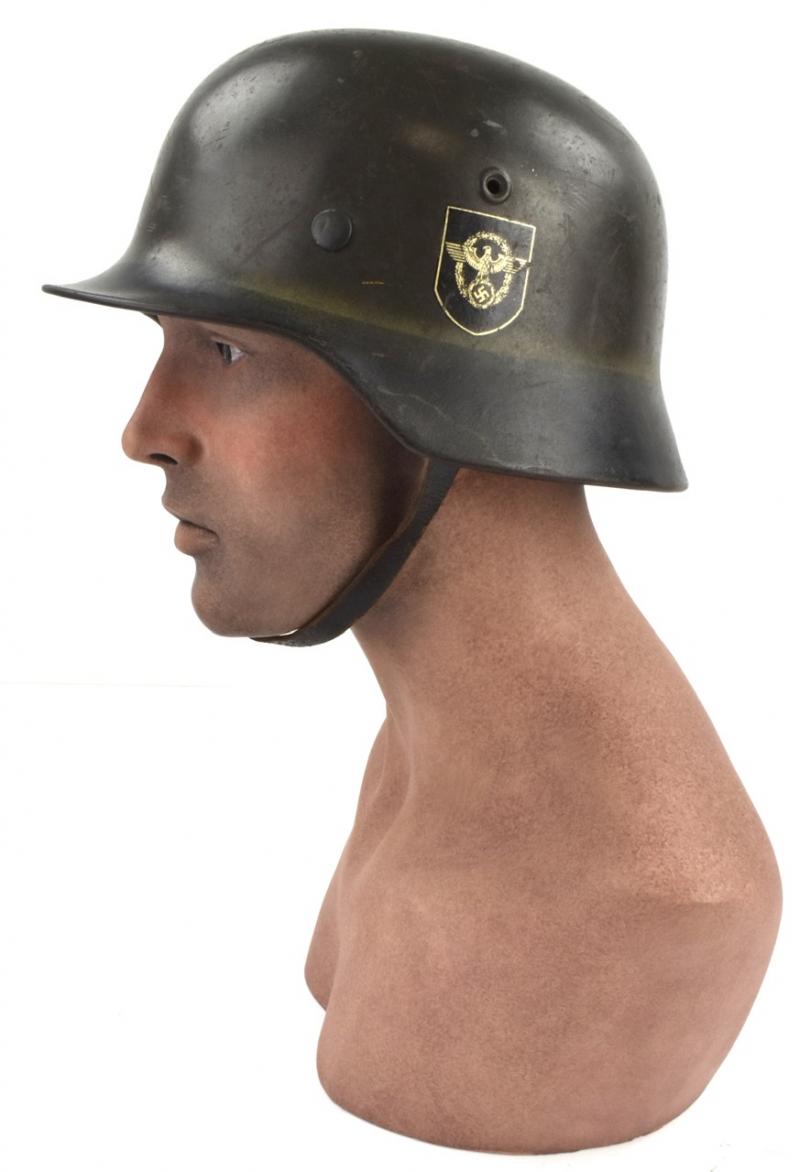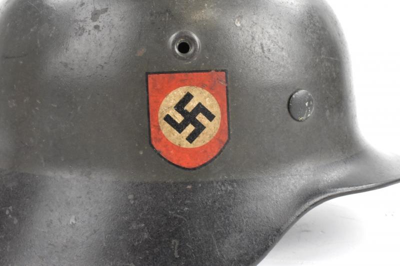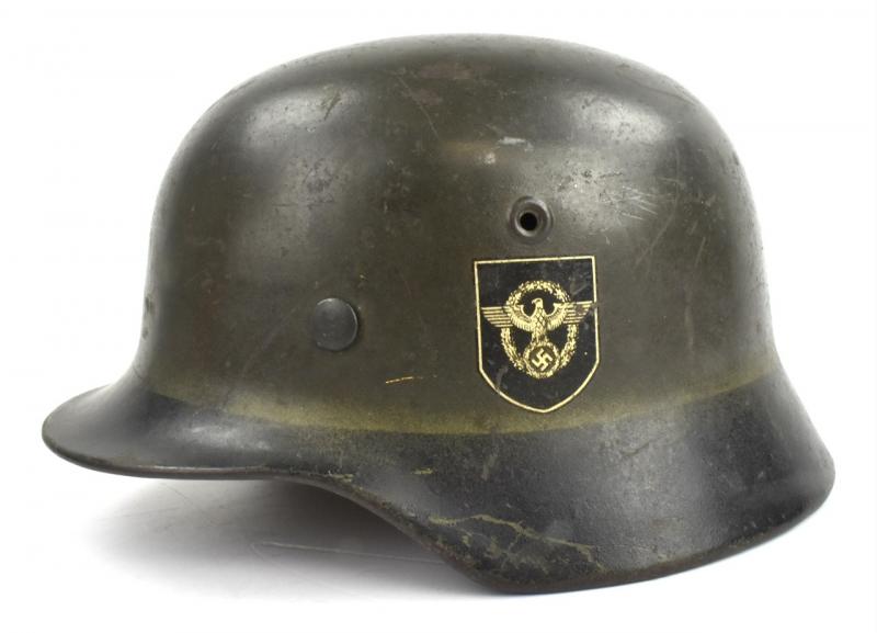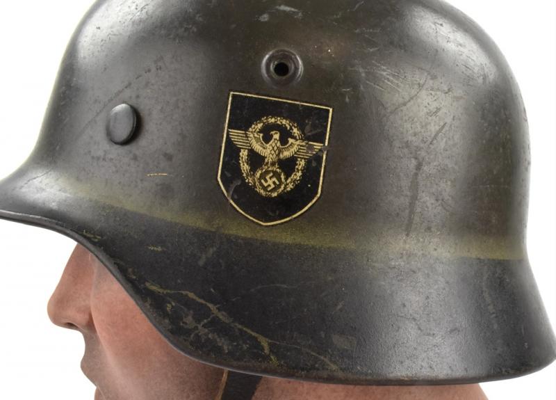 Very nice used combat “Polizei” (Police) helmet Dubbel decal M40 in nice early field greay camo paint with a black rim. Decal is 98% condition.