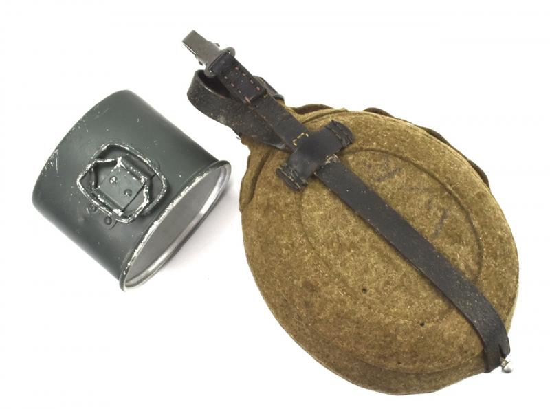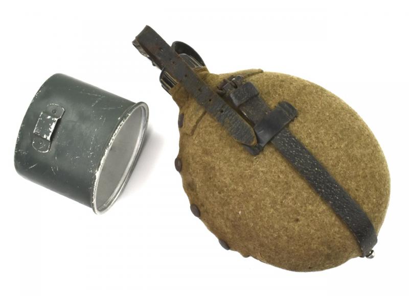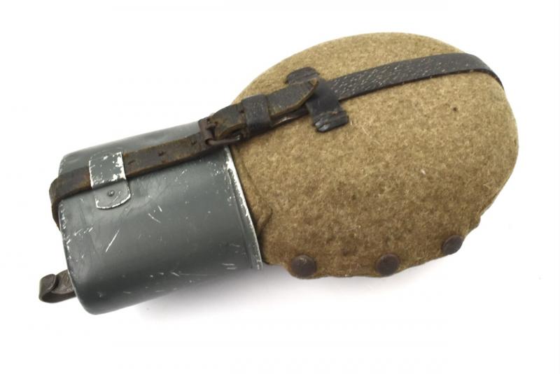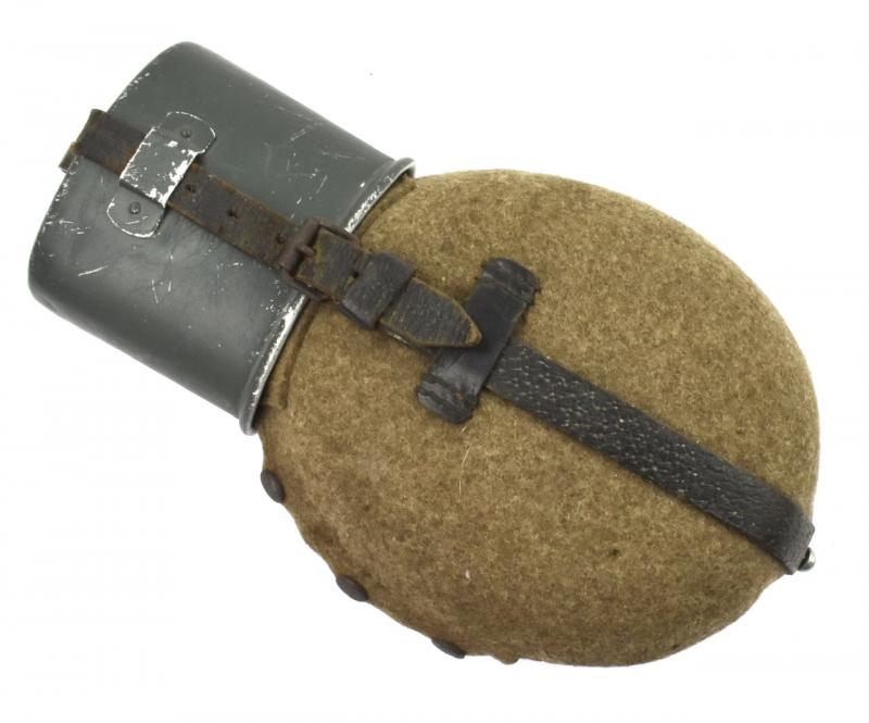 Wehrmacht M31 Canteen Nice used Wehrmacht M31 canteen With aluminum cup, felt cover and pig leather straps. Overal a nice M31 canteen in used but good condition. Great to your complete Wehrmacht equipment.