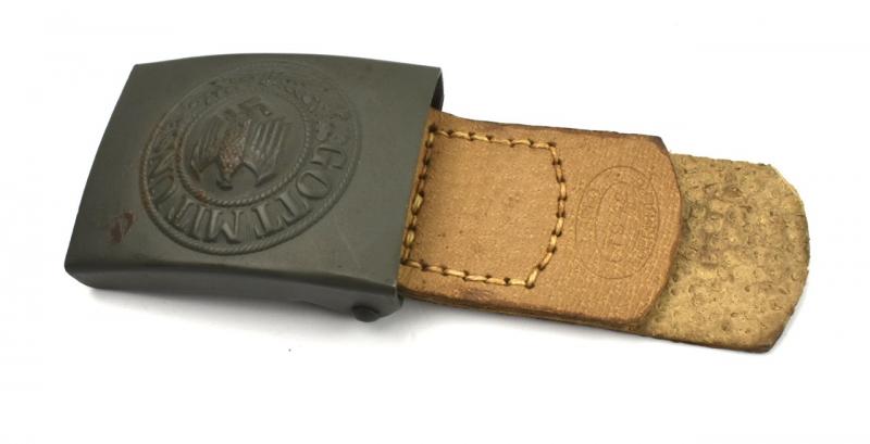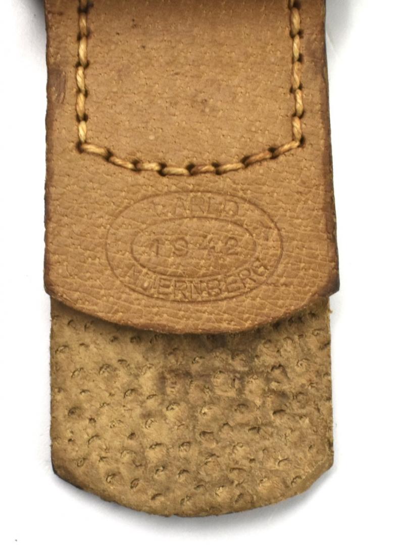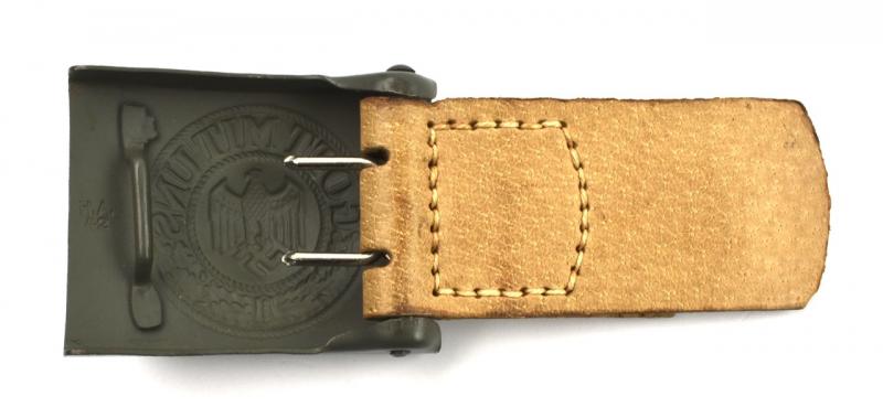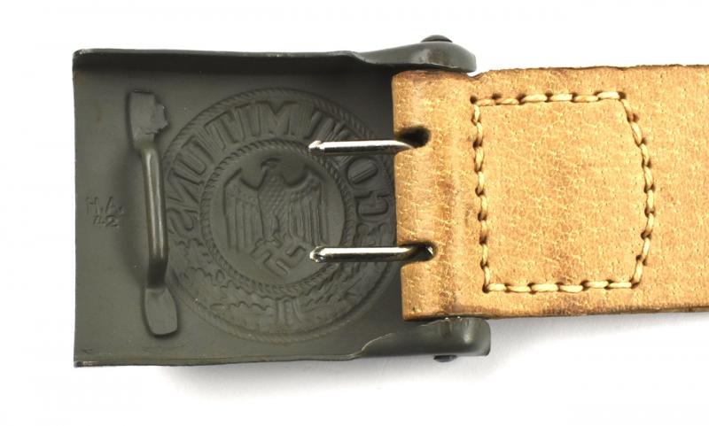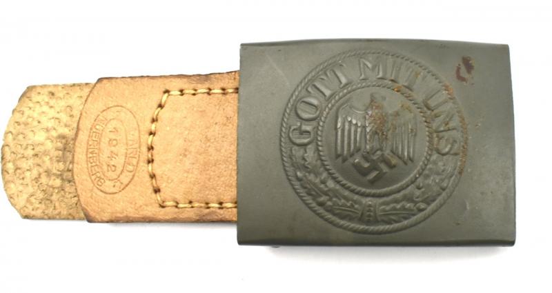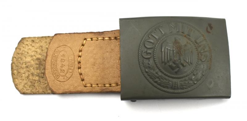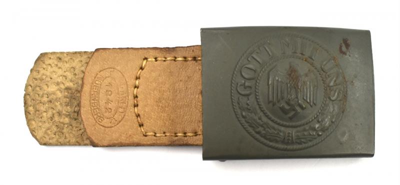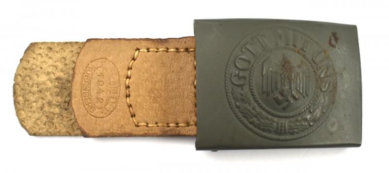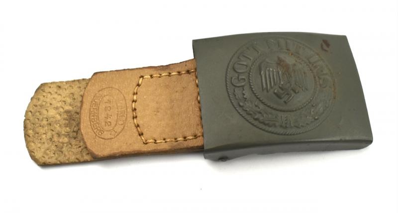 Very nice near mint steel Wehrmacht belt buckle with pig skin leather tab. Buckle in 98% of its original field/grey camo paint and maker code marked “H.A.” which is “H. Arld” and dated “1942” the tab is also marked “H. Arld” and also dated “1942”