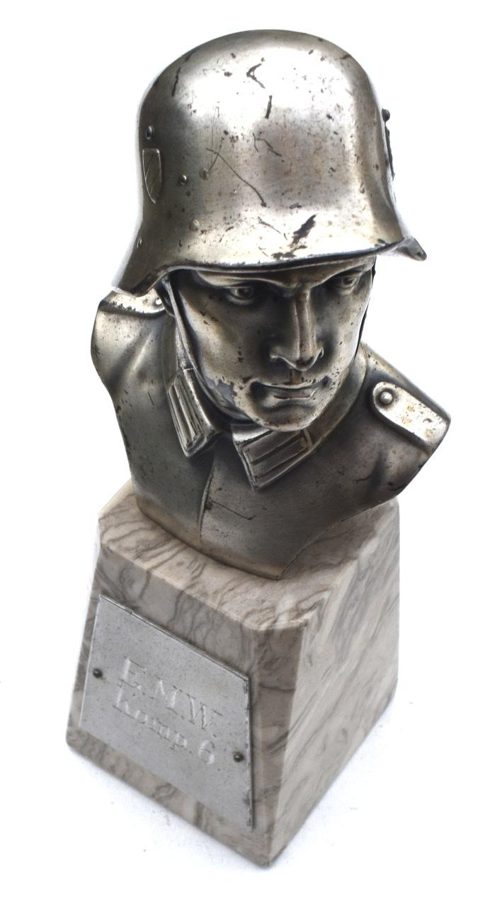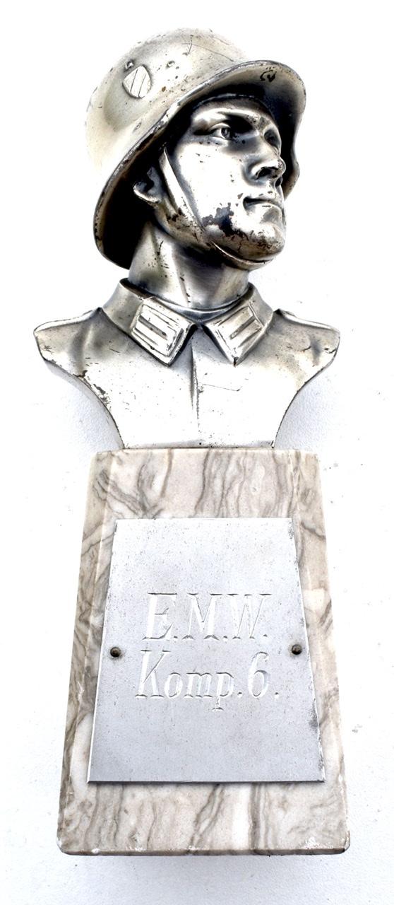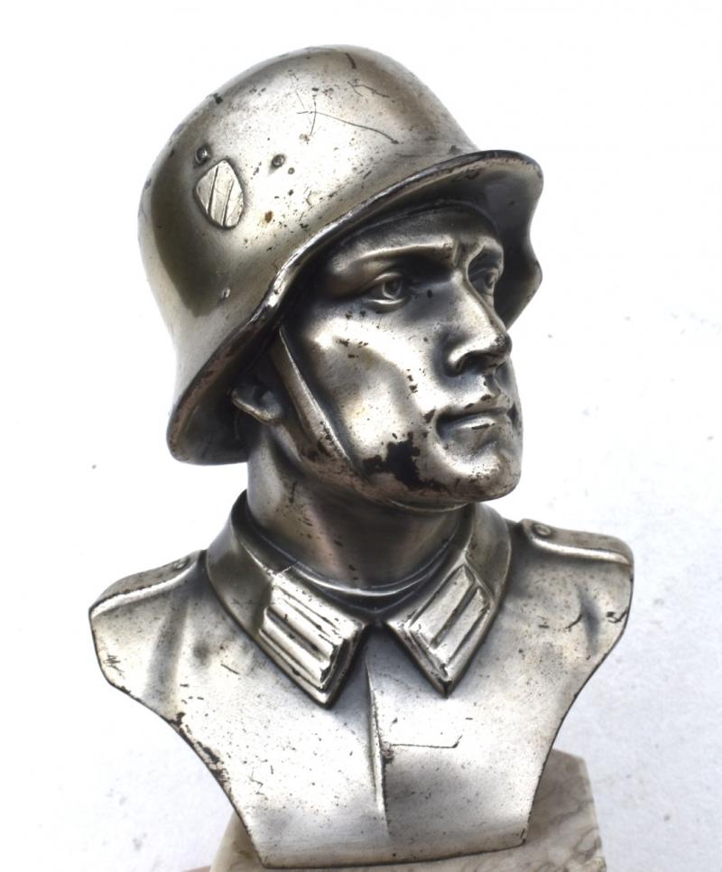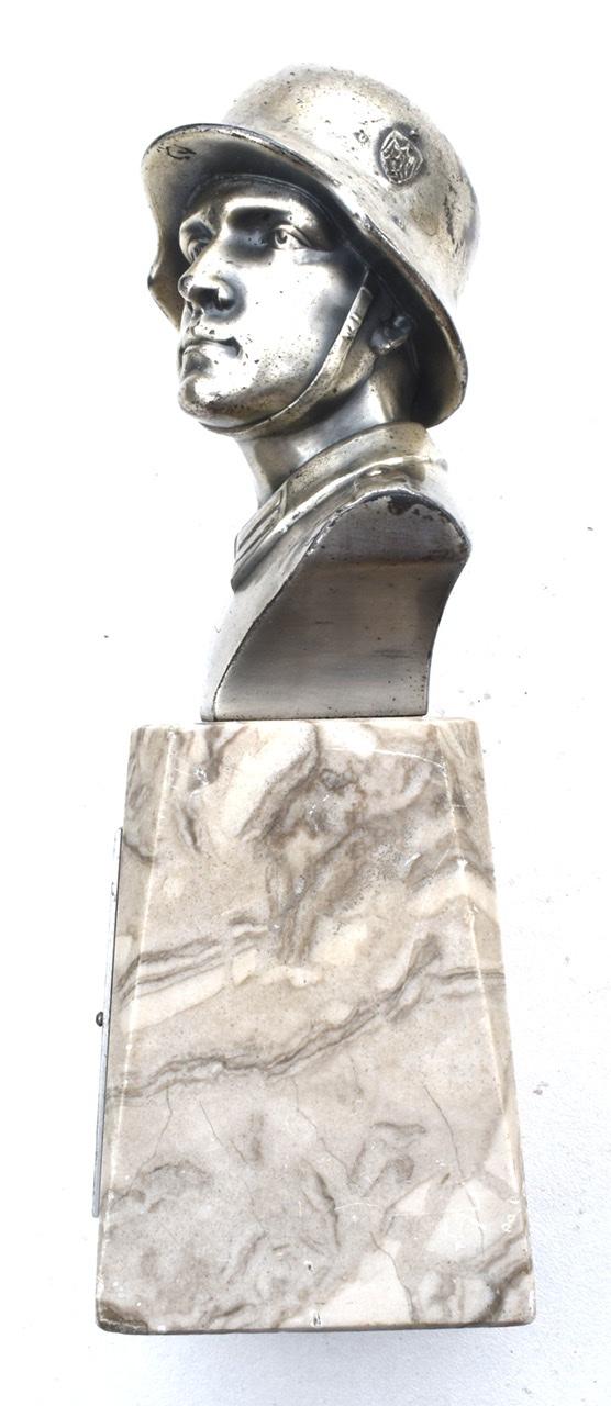 Very nice metal bust of a Wehrmacht soldiers head with his helmet on a marbel base. Bust Wehrmacht Soldier