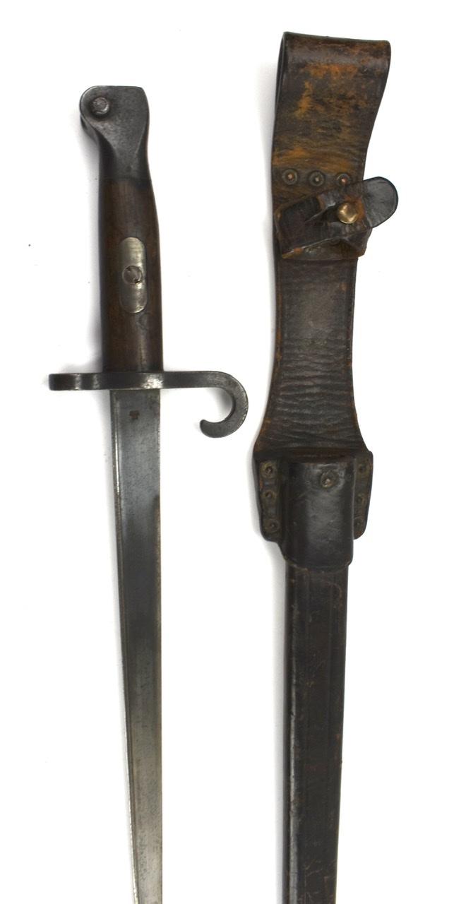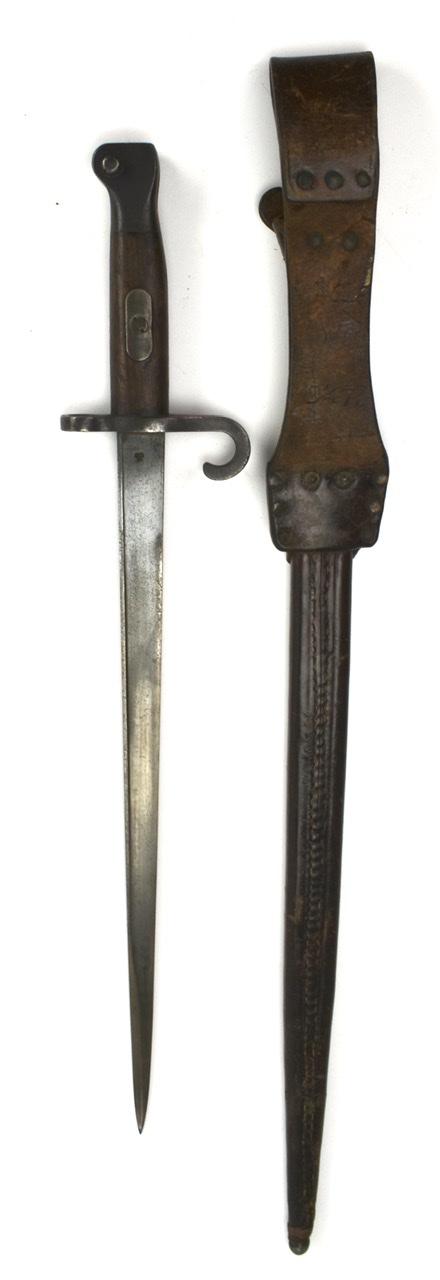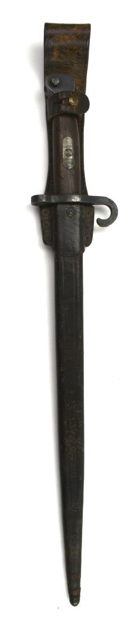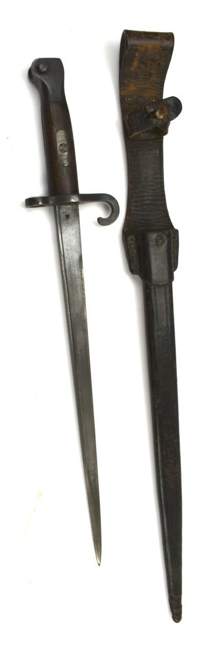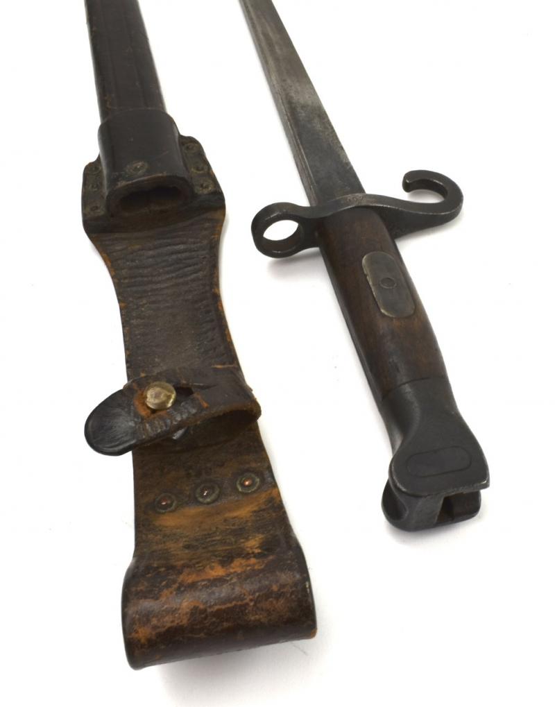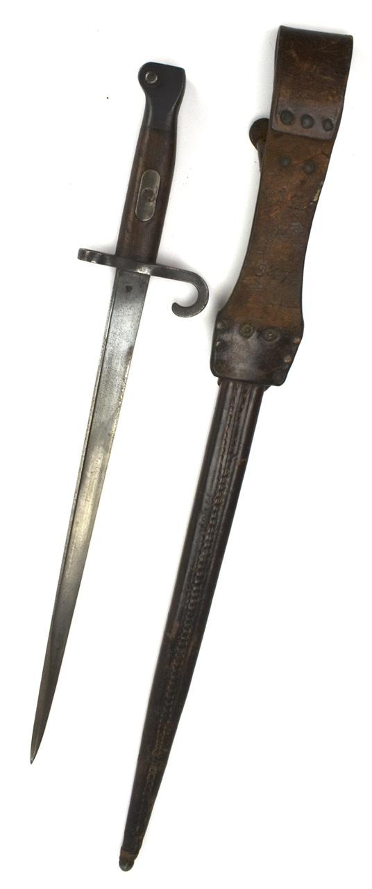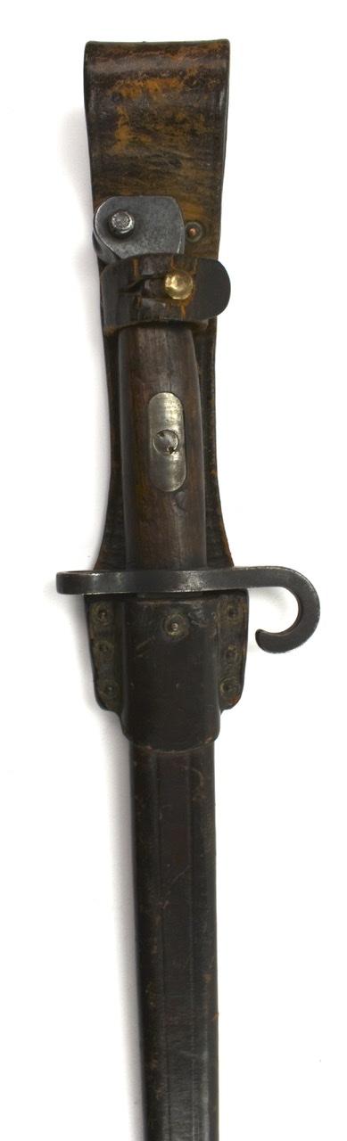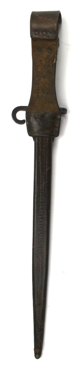 Very nice used and rare Dutch “Navy” M95 bajonet with its original leather scabbard and still with the so-called “Stacking hook” which was removed from almost all bajonets of several models and country, because of the international law in that period of history. The wooden grips could be removed, which was typical “Navy” to clean the bajonet from salt from sea water. Overal a very nice used Dutch Navy M95 bajonet in very good condition. Hard to find!