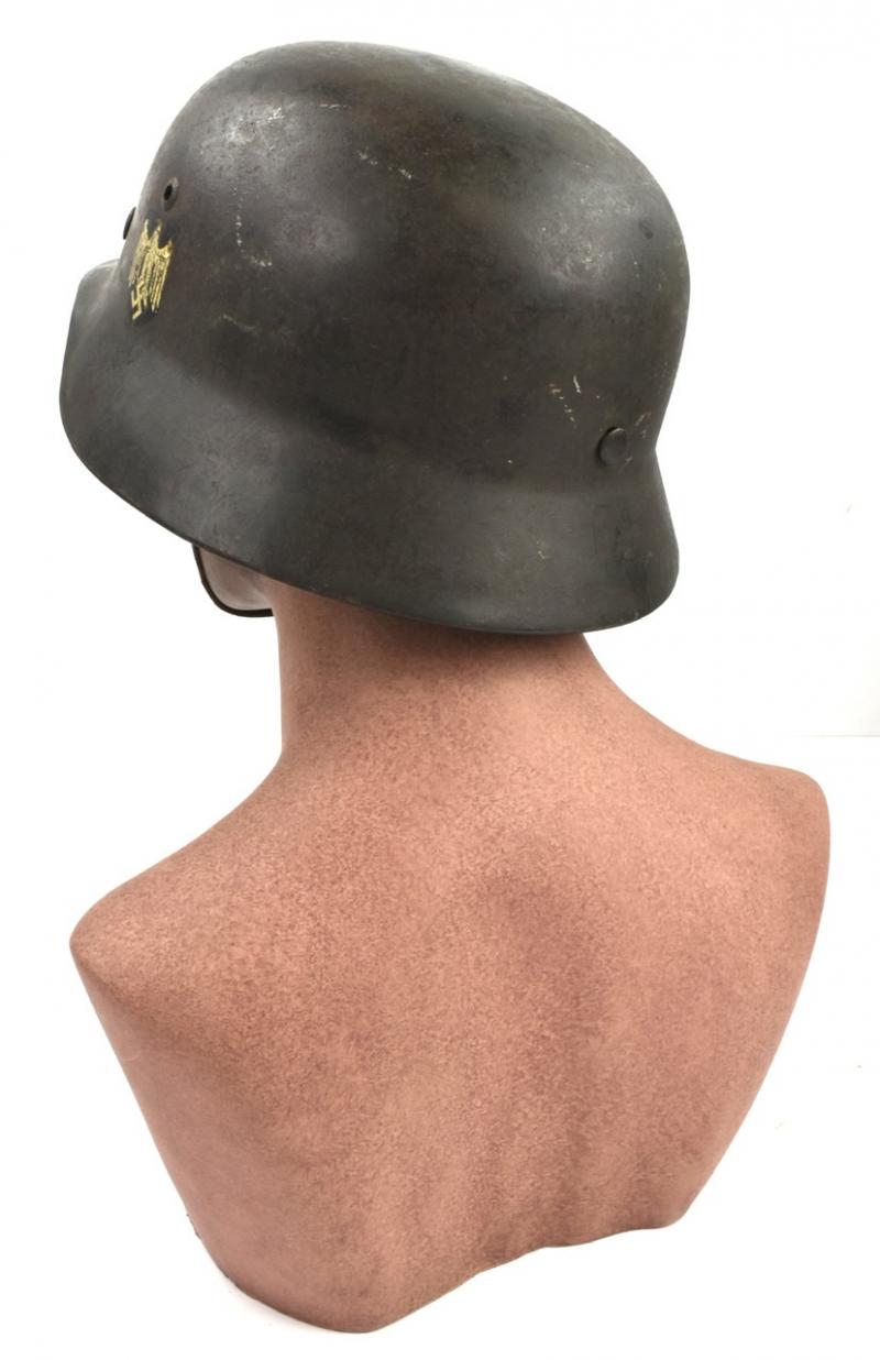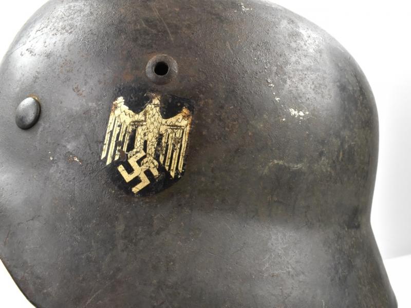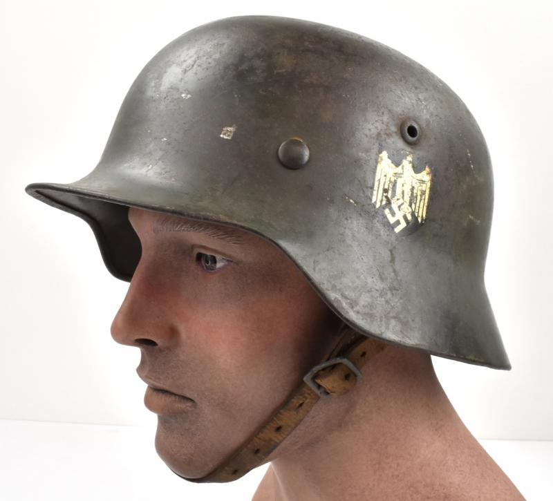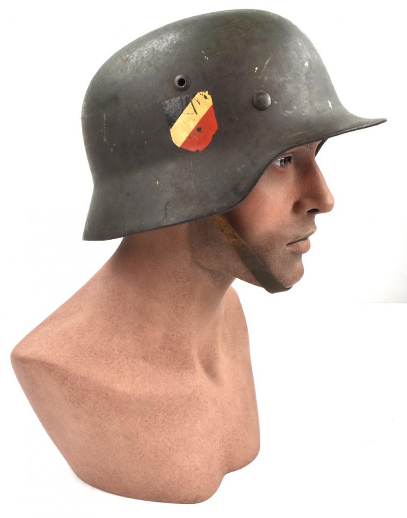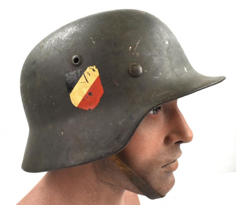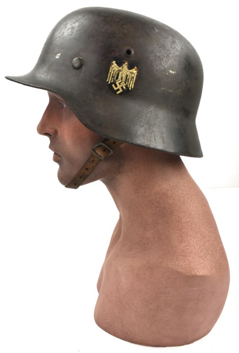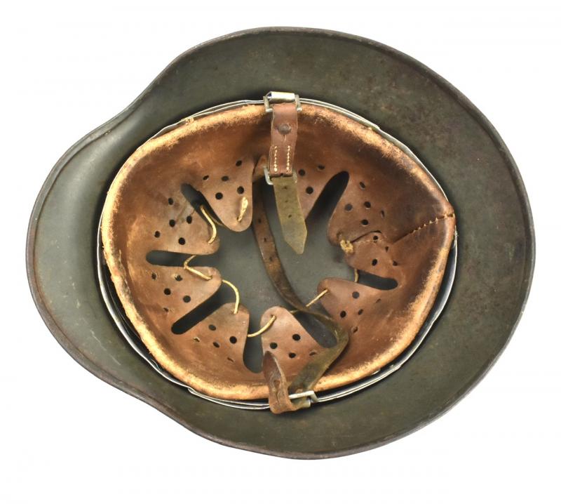 In nise big size “68” and with its original second model aluminum liner with aluminum re-enforcement strips. Both decals are in 95% condition. The liner is named inside and the helmet has a nice original leather combat helmet strap. Overal a very nice used and untouched Wehrmacht M35 DD helmet in very good condition. Great for a helmet collection or to complete a nice early combat tunic!