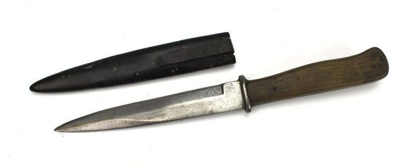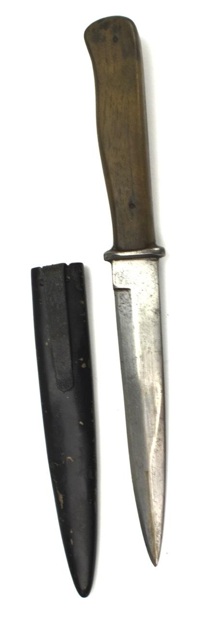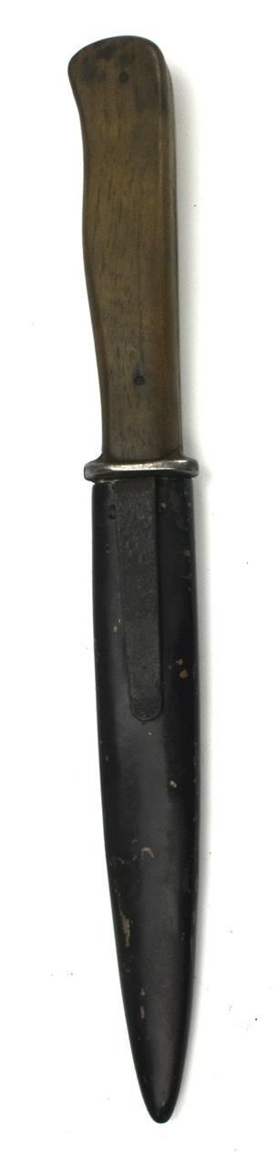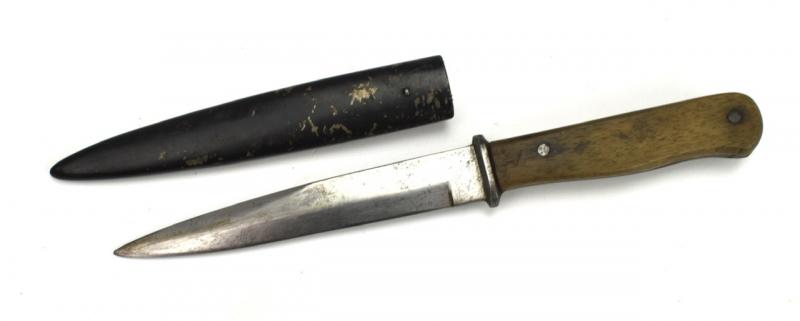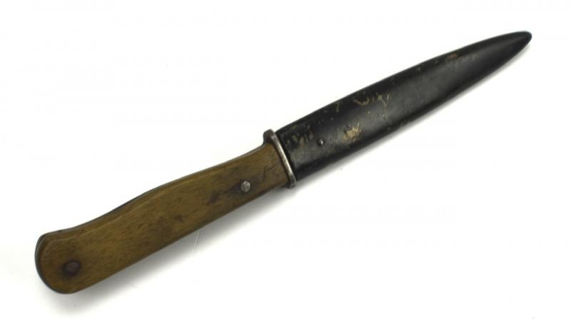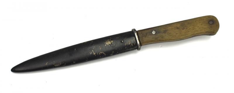 “Nakampf Messer” in its original metal scabbard with belt clip. Overal a very nice combat knife in used but good condition. Fantastic for a combat knife collection of on a mannequin.