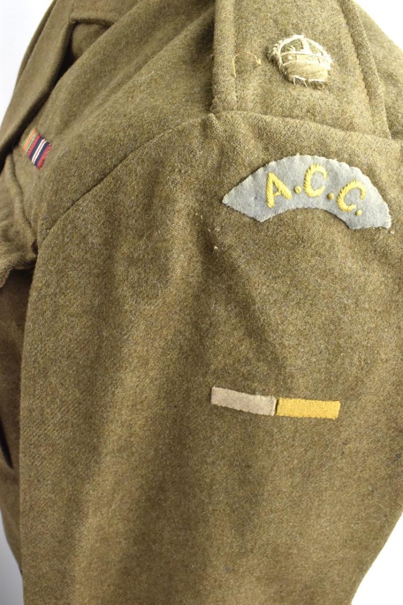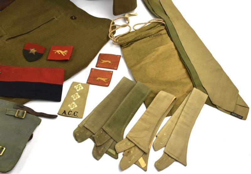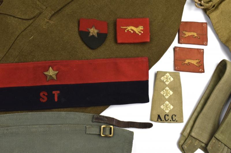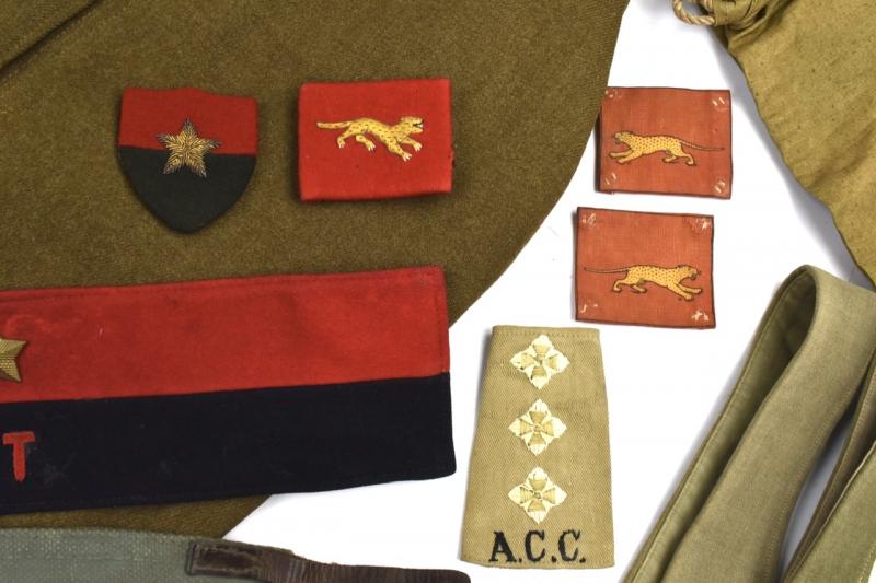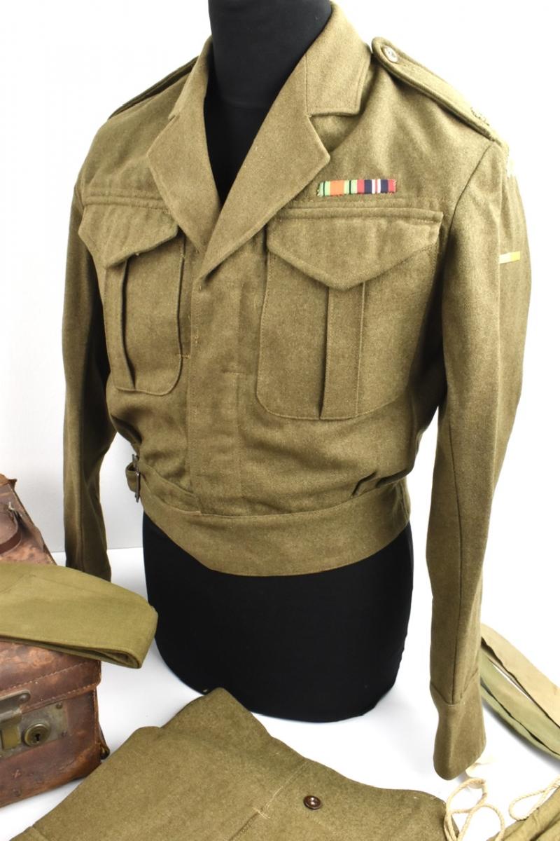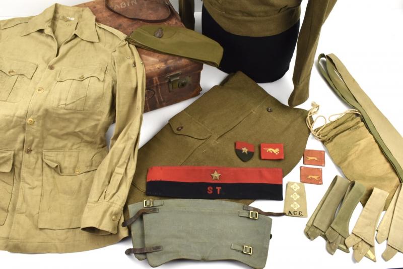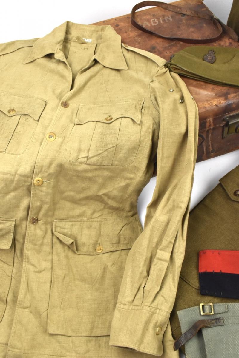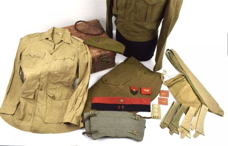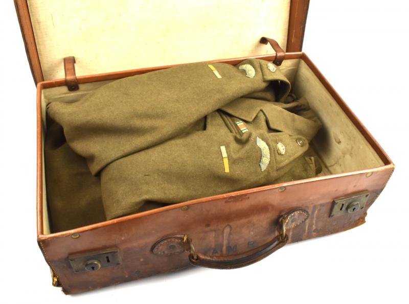 “1940” Patern Battle Dress with cloth label, dated “1942” and Battle Dress trousers has year letter “N” with de “War Department” stamp which is “1943” with the grouping comes the tropical shirt, 2 ties, 4 collars, a leather suitcase with his initials, named pouches, several cloth insignia, armband and his former shoulder board rank ACC, gators and his overseas Cap. Overal a very nice named uniform grouping in used but very good condition.