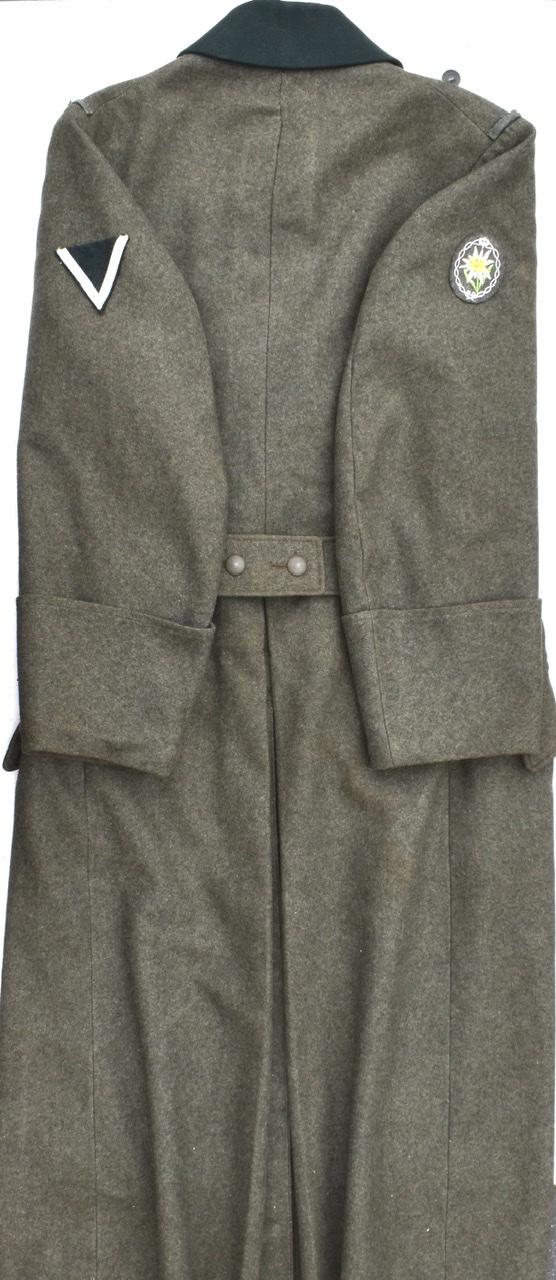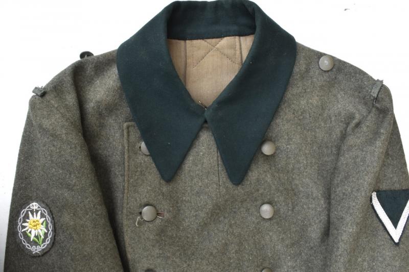 The greatcoat has rank insignia (Gefreiter) and a “Edelweiss) cloth badge from the Gebirgsjäger units.