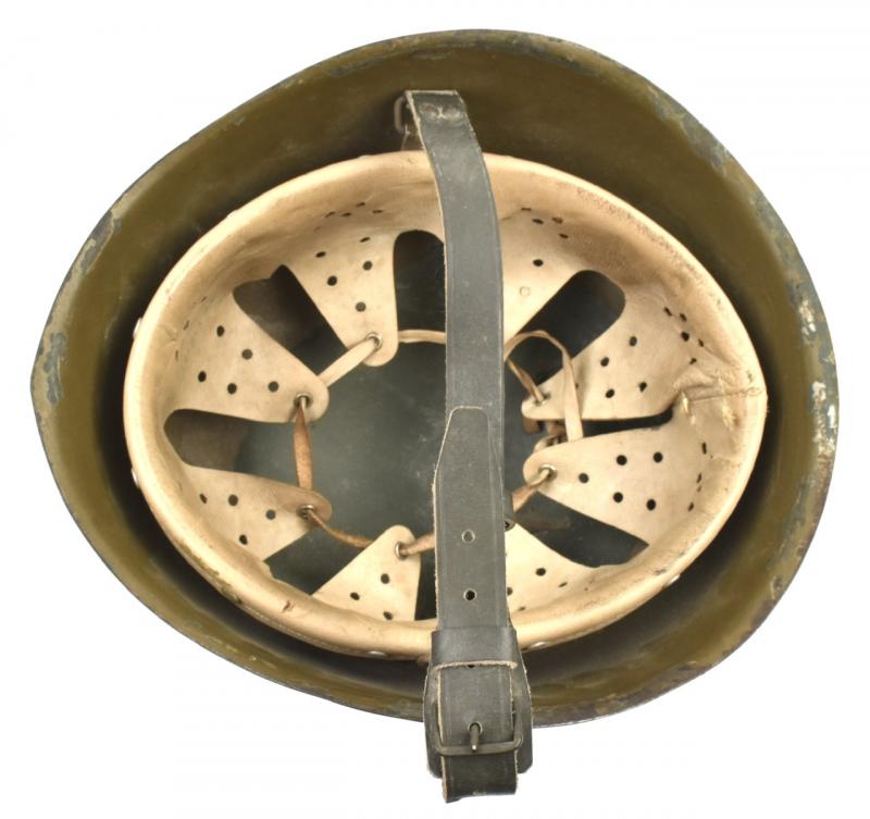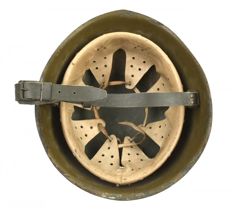 This black version was used by the Italian fascist movement. The Helmet with military camo paint was used for the Army. Nice helmet with original military camo paint, original liner and leather helmet strap.