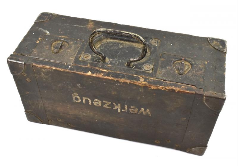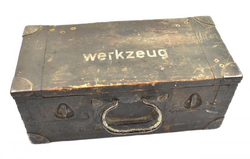 Case used for spare parts and tools for maintenance of the mortar! In its original field grey Wehrmacht camo paint. Nice for display or a woorden case collection!