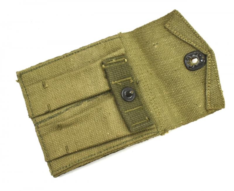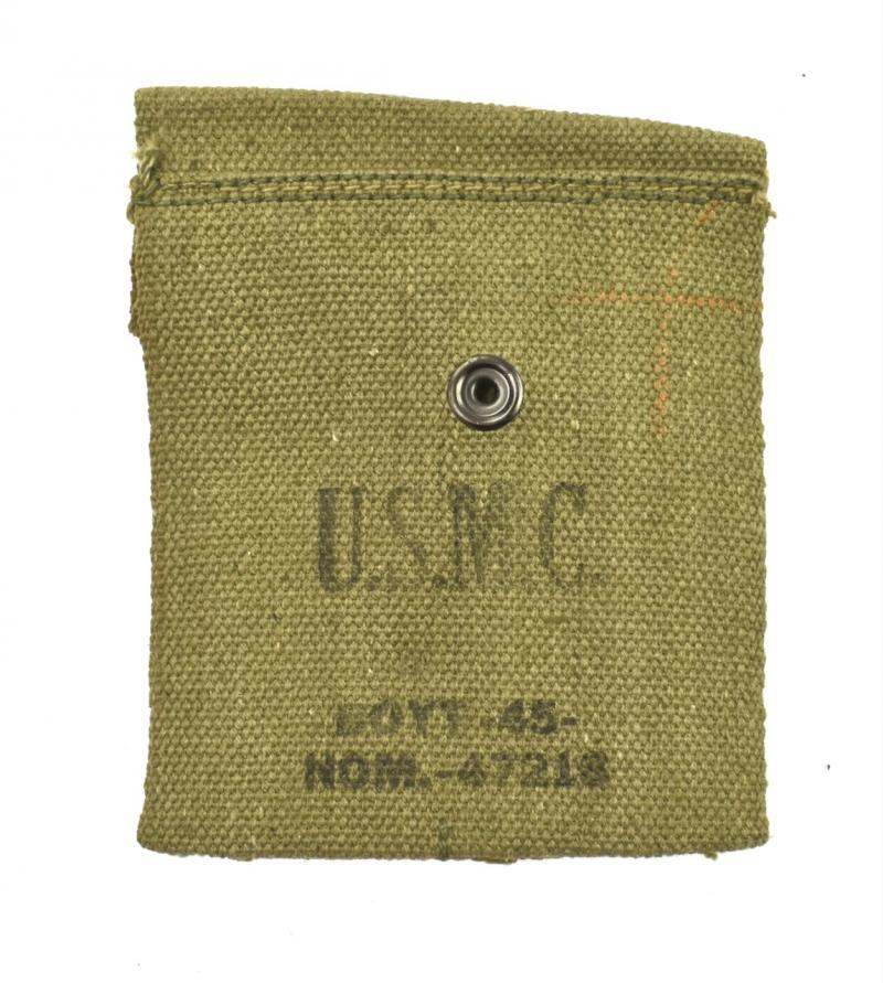 Marked “USMC” and maker marked “Boyt” and dated “1945” The pouch would holt 2 box magazines which would holt 8 rounds each of Cal. 45 ACP pistol rounds. Very nice pouch in mint condition!