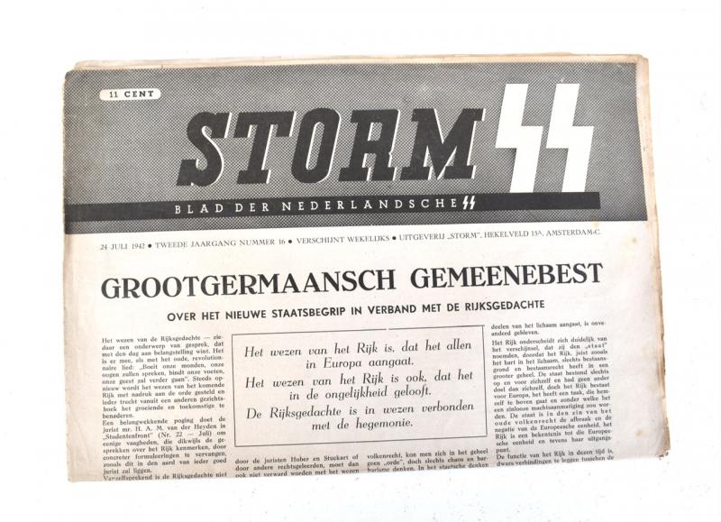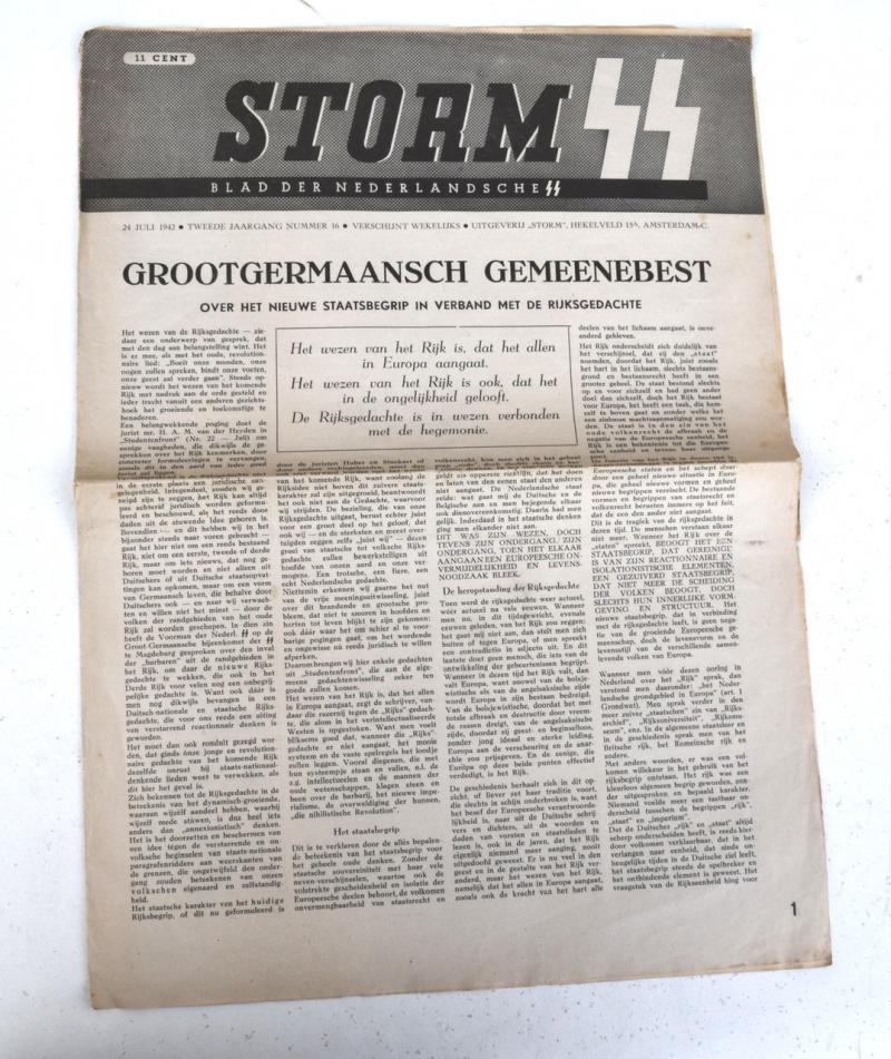 StormSS Newspaper “Blad der Nederlandsche SS” Dated “July 24, 1942” Nice used newspaper for members of the Dutch SS Headline “Groot Germaansch Gemeenenbest” Nice decorative SS newspaper in used but good condition!