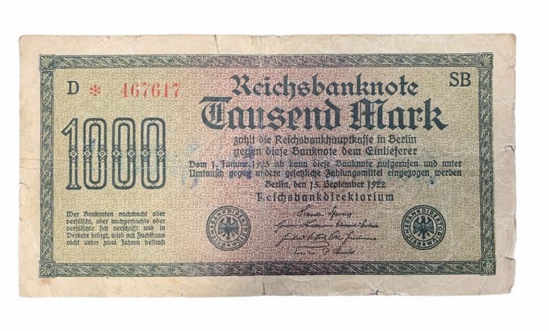 Very rare early 1930's Third Reich bank note of 1000 Reichs Marks, reprinted on its back with anti Jew propaganda "Kauft nicht bei Juden!" (Do not buy from Jew's) in used but very good condition!