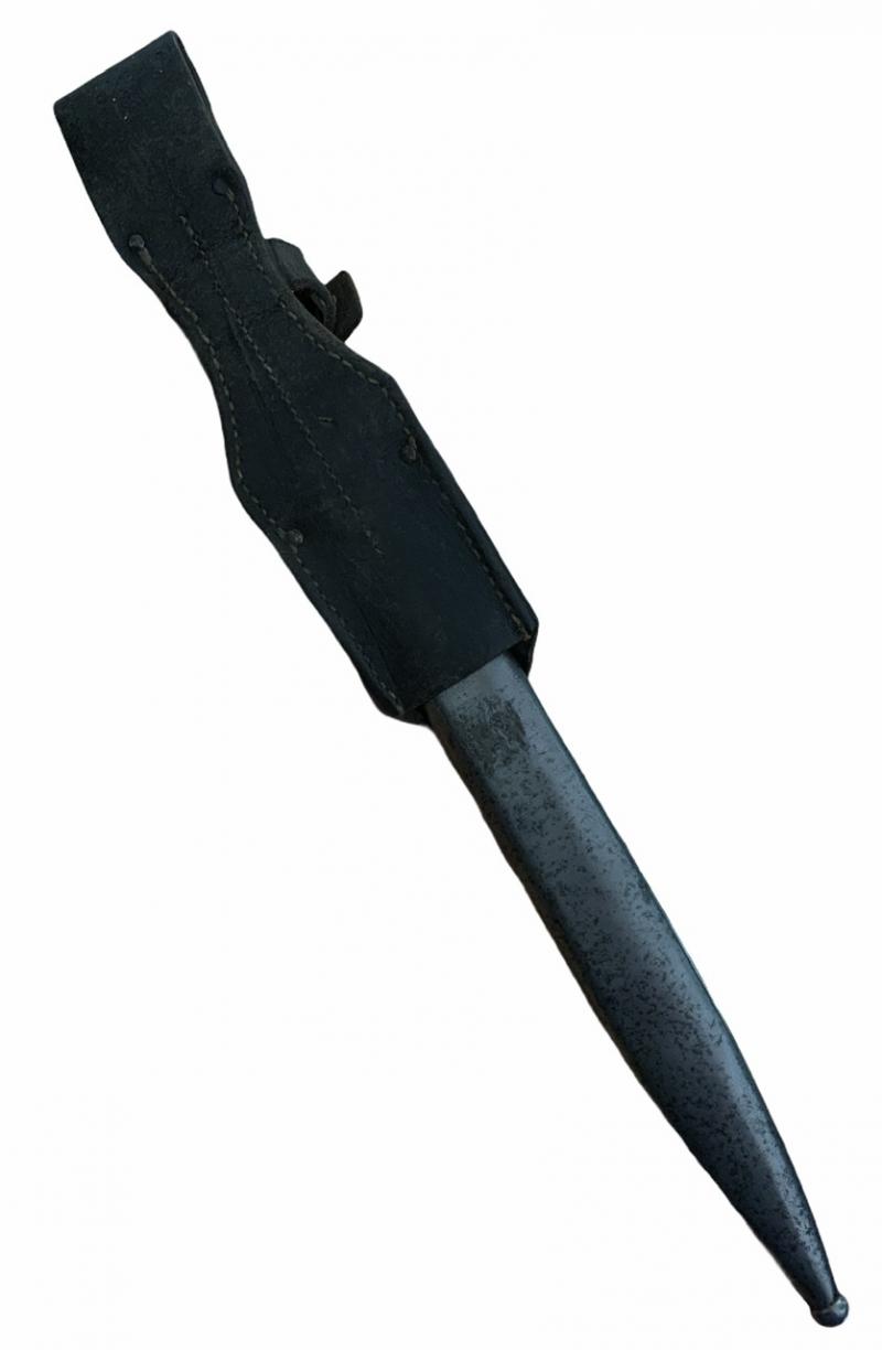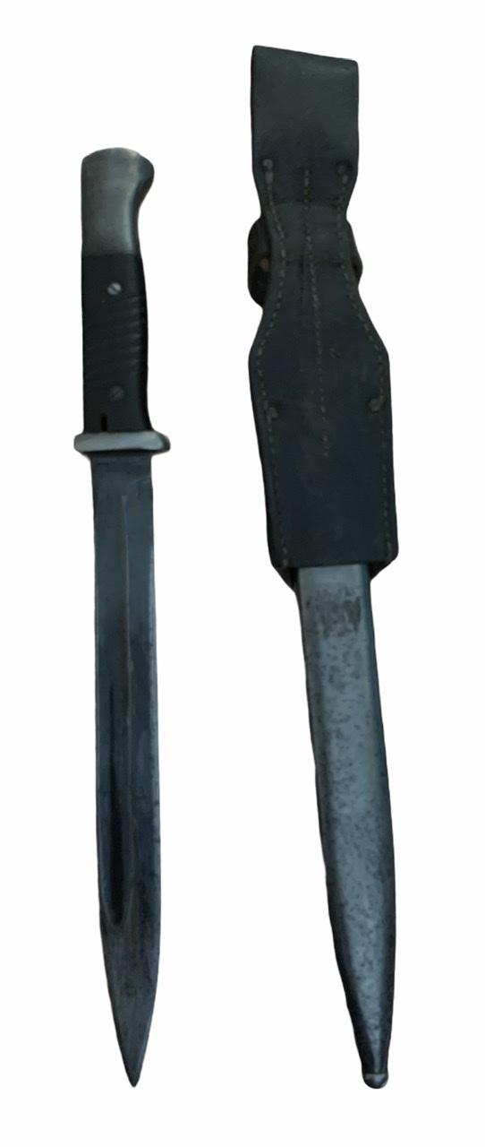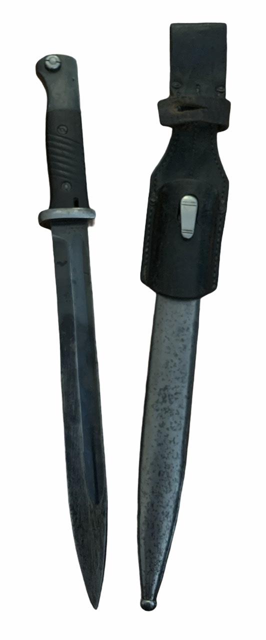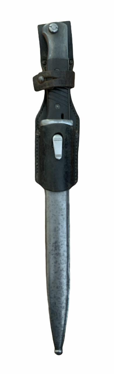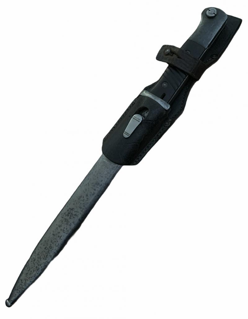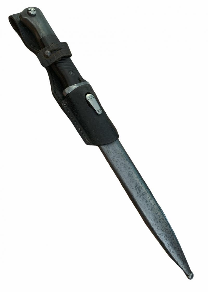 K98 Bayonet with Frog Nice used non matching K98 bayonet with early style leather frog. Bayonet made by “E.u.F. Höster, Solingen” Overal a nice used bayonet with bakelite grips In good condition.