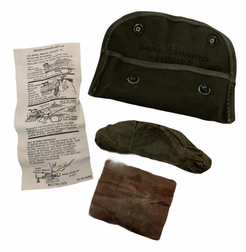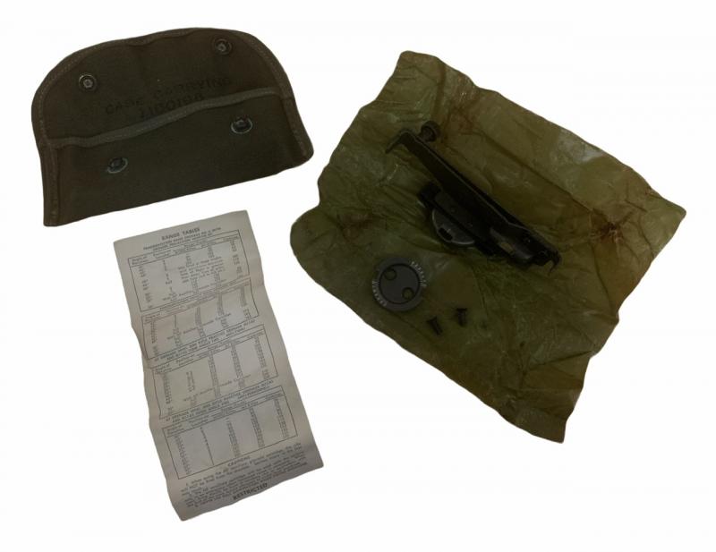 with its attached part to attach the sight to a US Cal 30.06 M1 Garand, US 1903 Springfield or a US Cal .30 M1 Carbine. The sight comes with its original instructions form and original carrying pouch.