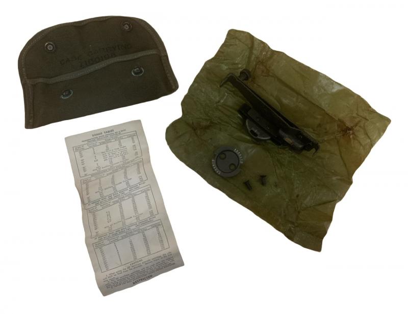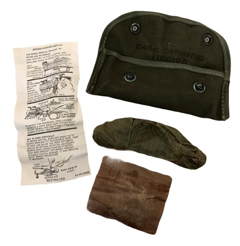 with its attached part to attach the sight to a US Cal 30.06 M1 Garand, US 1903 Springfield or a US Cal .30 M1 Carbine. The sight comes with its original instructions form and original carrying pouch.