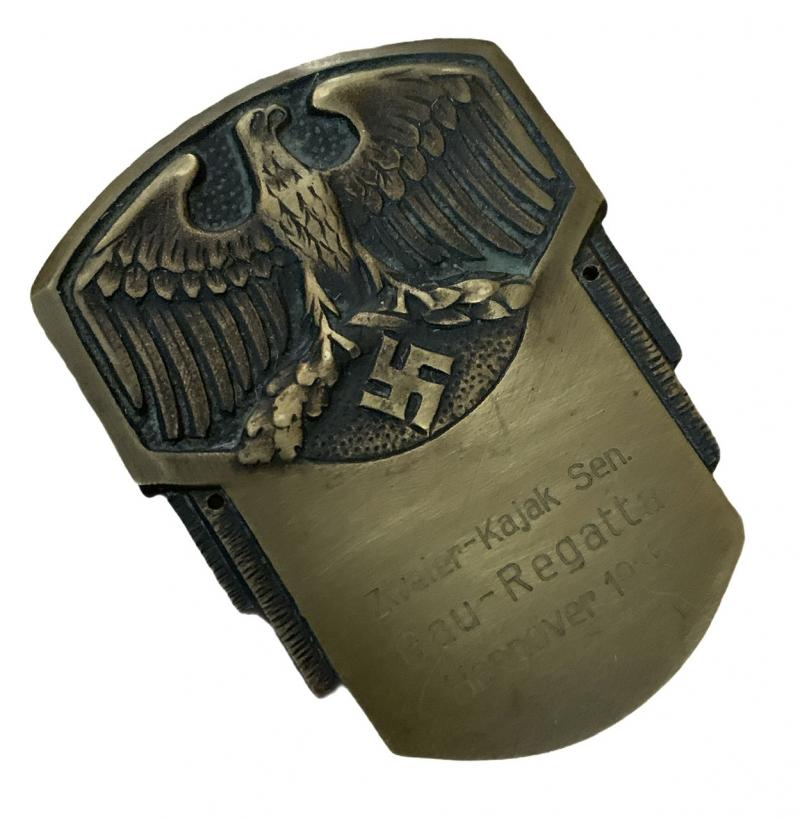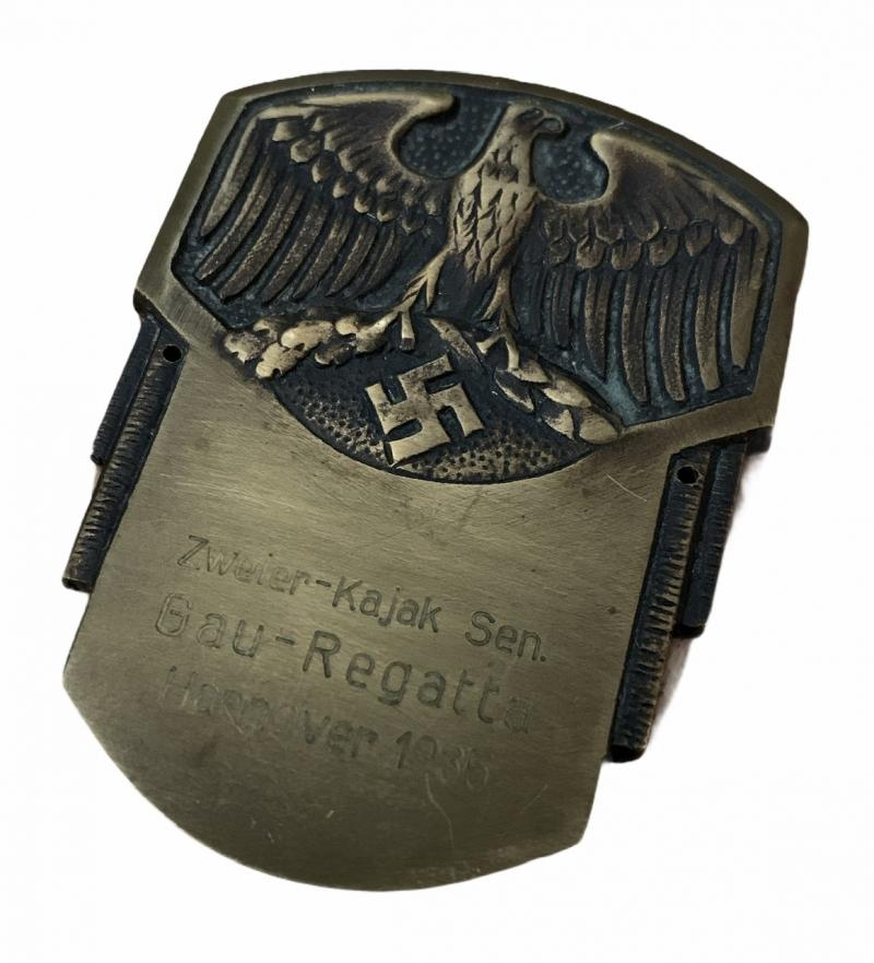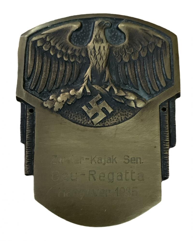 Vehicle/boot Plaque Regatta 1935 Brass made vehicle/boot plaque for the “Zweier-Kajak Sen. Gau Regatta, Hannover 1935” In used but very good condition Nice decorative item!