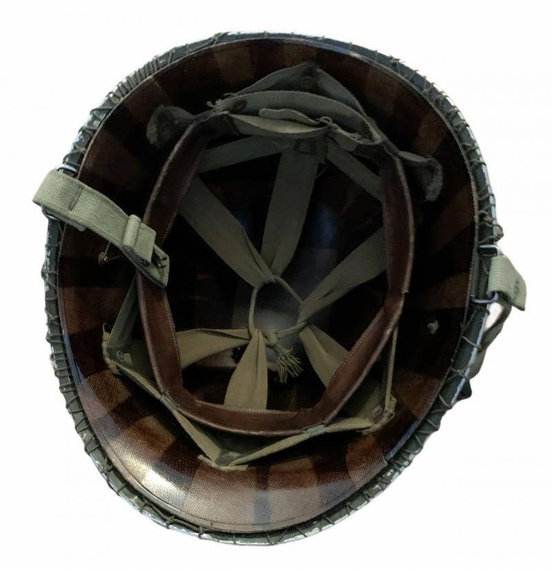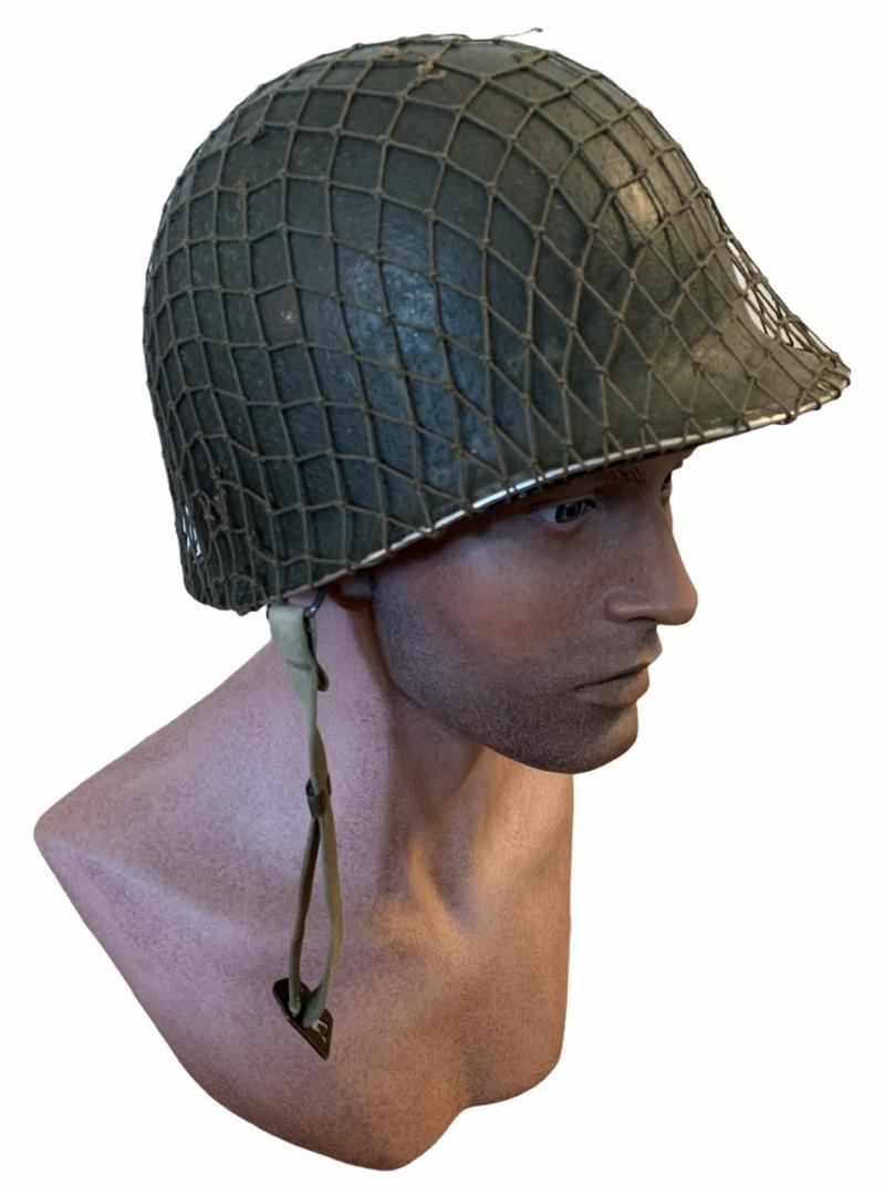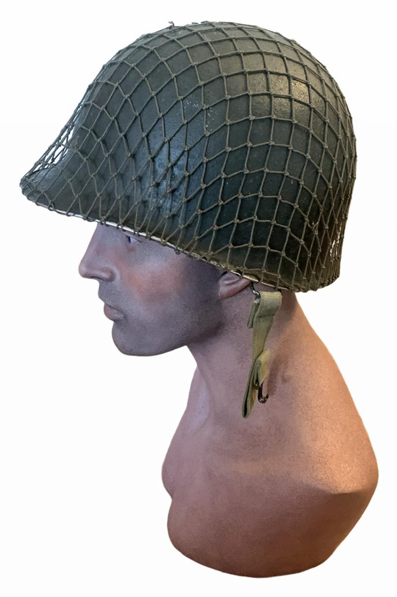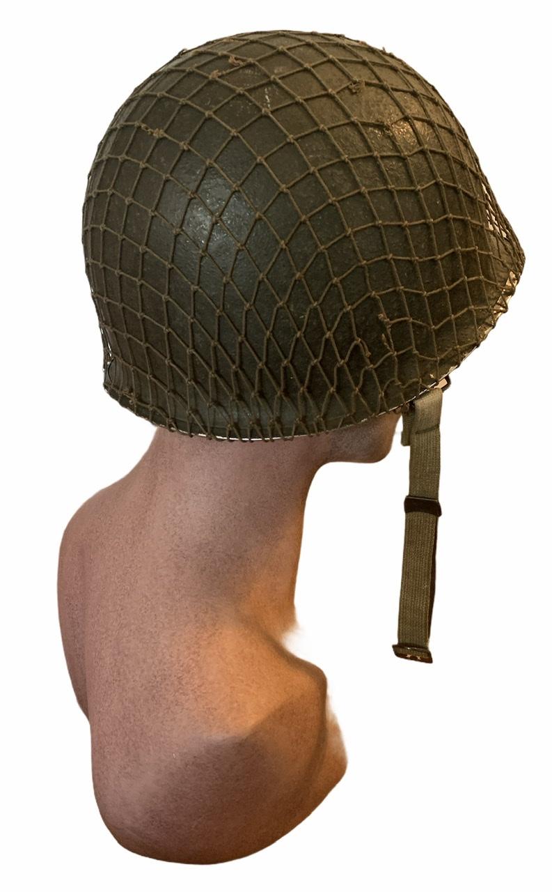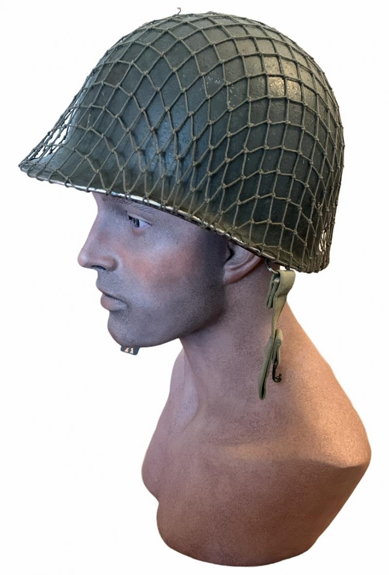 Used but very nice US WW2 swivel bail frontseam helmet with camo net.