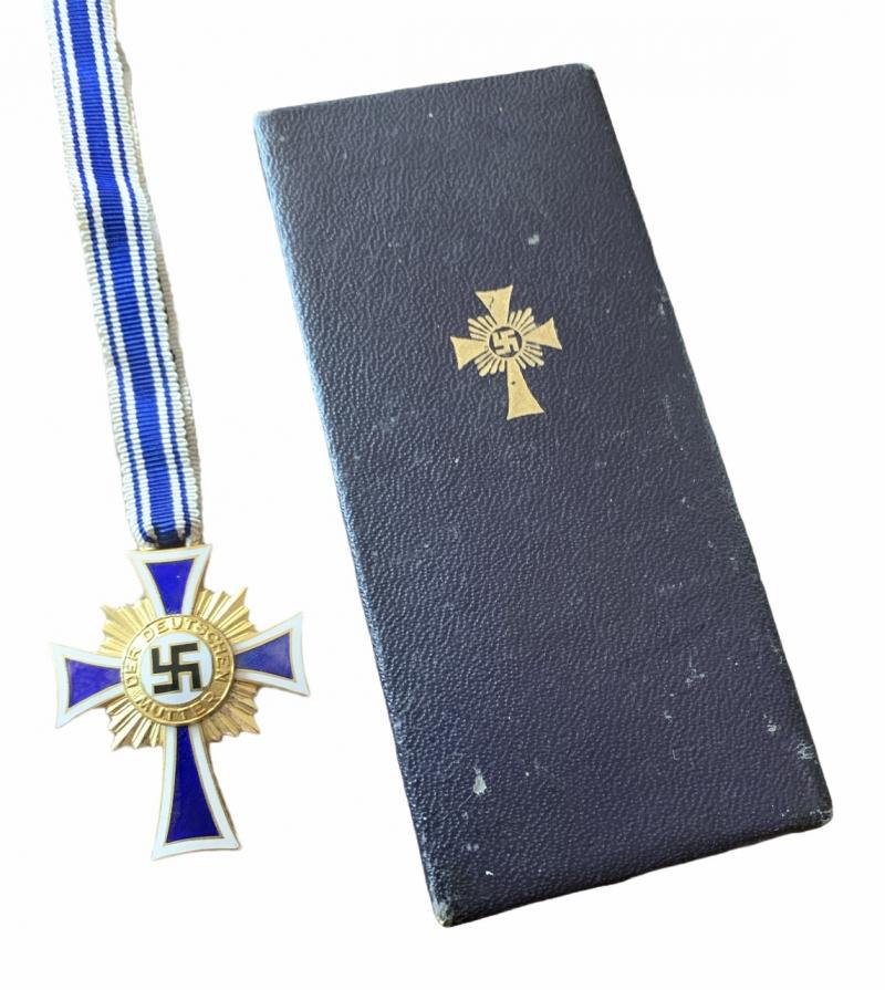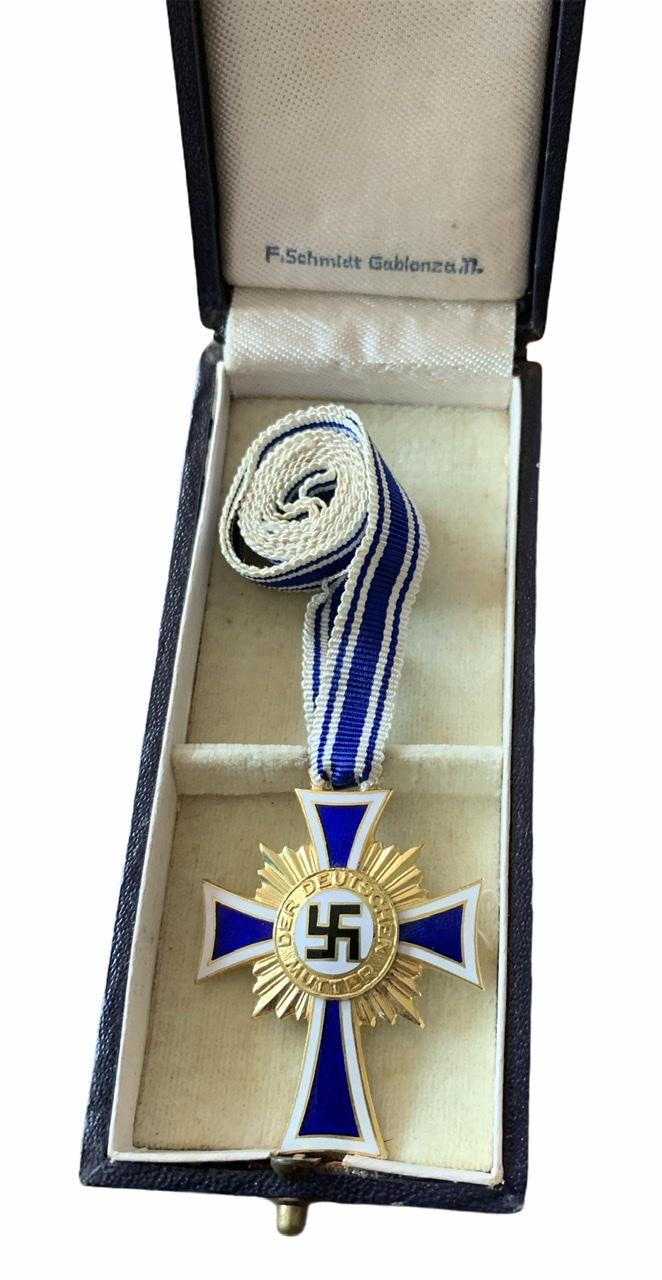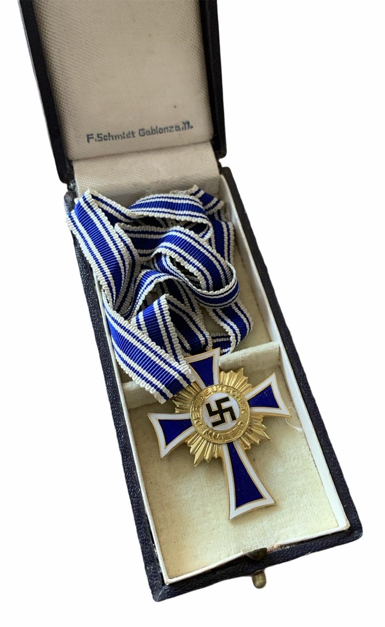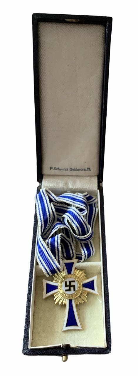 Mothers Cross in gold in Case Very nice mothers cross in gold, with original ribbon. In its original case, nicely maker marked "P Schmidt, Gablonz a N” In very good condition.