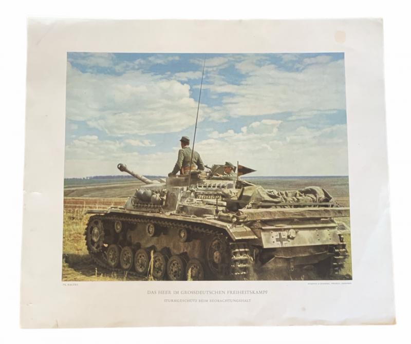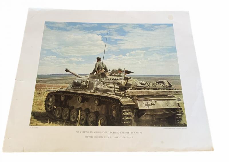 Very nice big size 32 x 37 cm full color “Sturmgeschutz” tank poster for an official art series “Das Heer im Grossdeutsche Freiheitskampf”