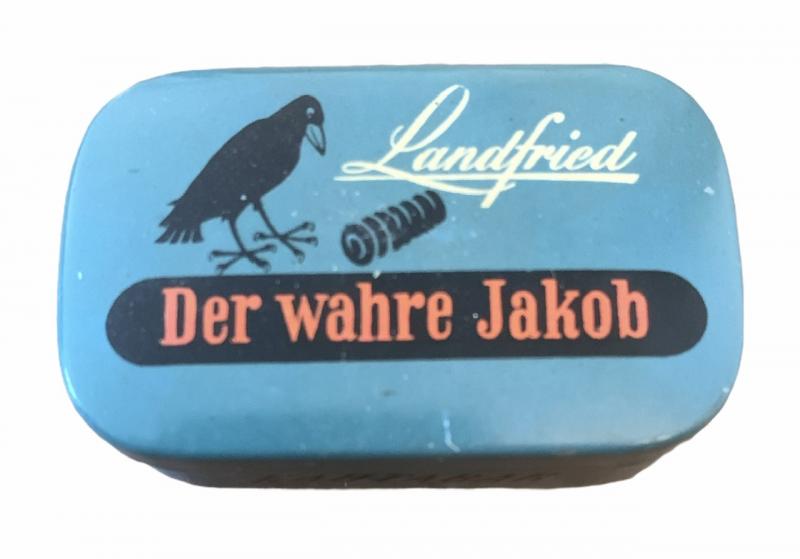 From the brand "Landfried, Der Ware Jakob" very nice decorative metal can, perfect for a personel item display. In very good condition.