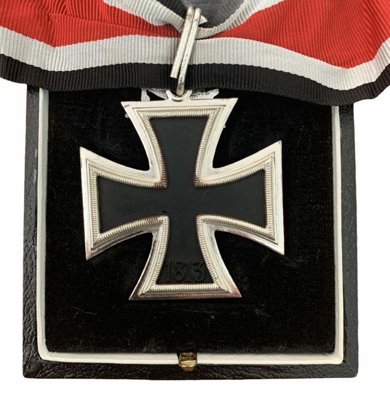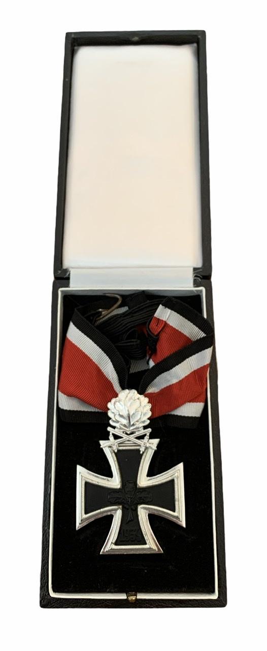Nice used 1957 sample of the Knights Cross with Oakleaf and Swords in case and complete with its ribbon. In very good condition.