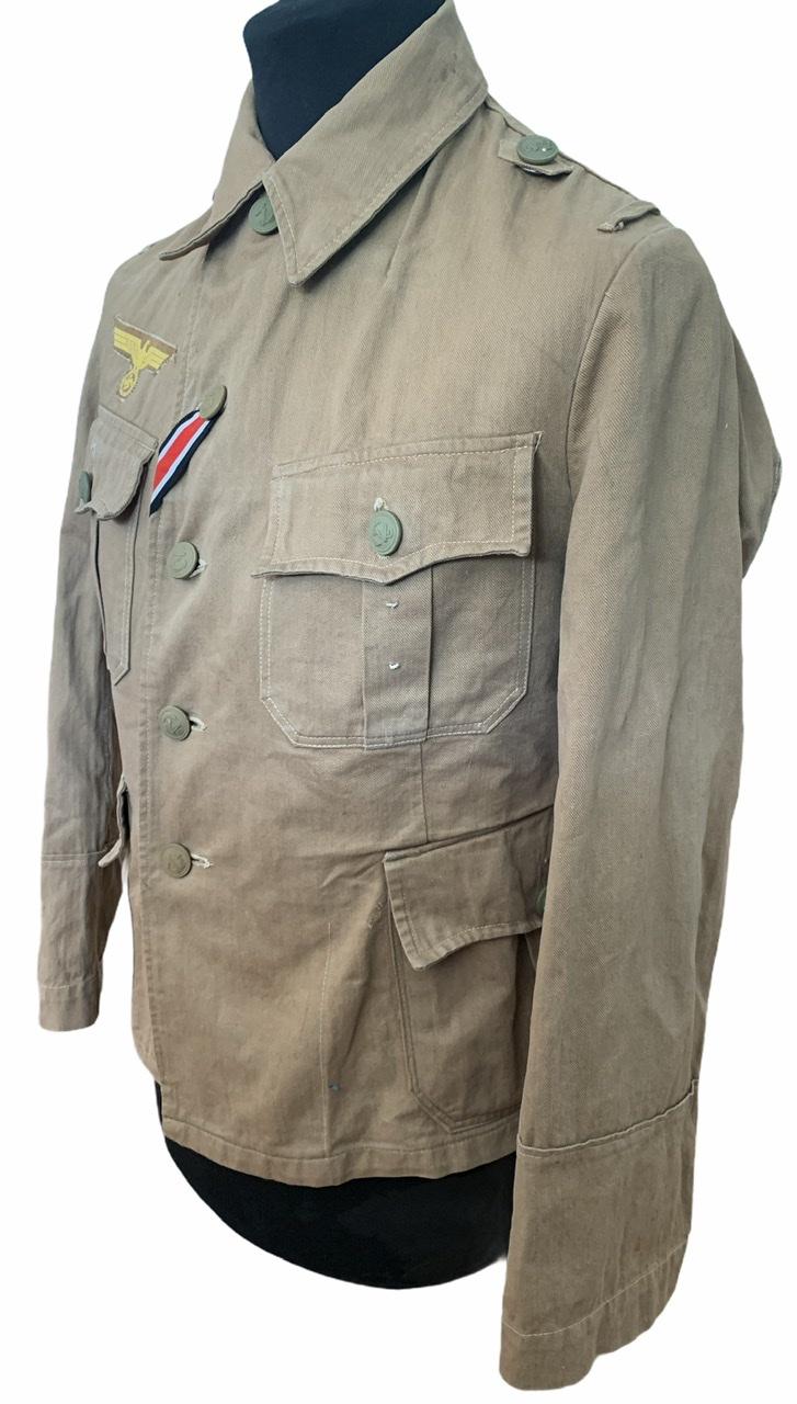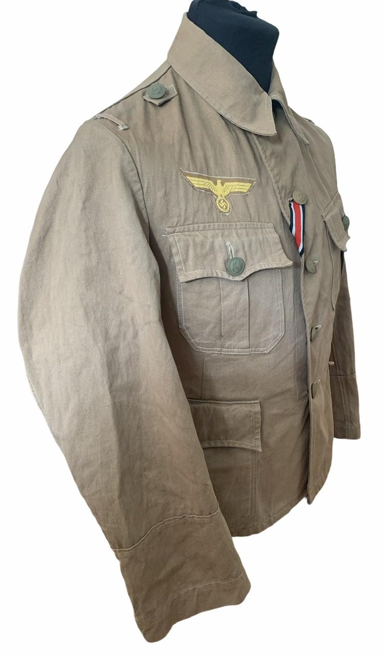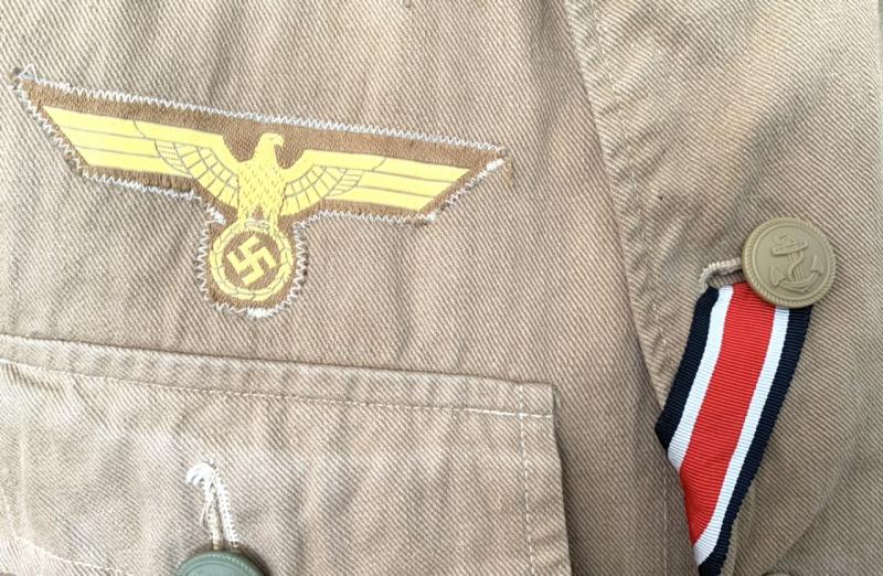 Eagle original sewed to the tunic. Overal a very nice complete tropical Kriegsmarine uniform in used but very good condition.