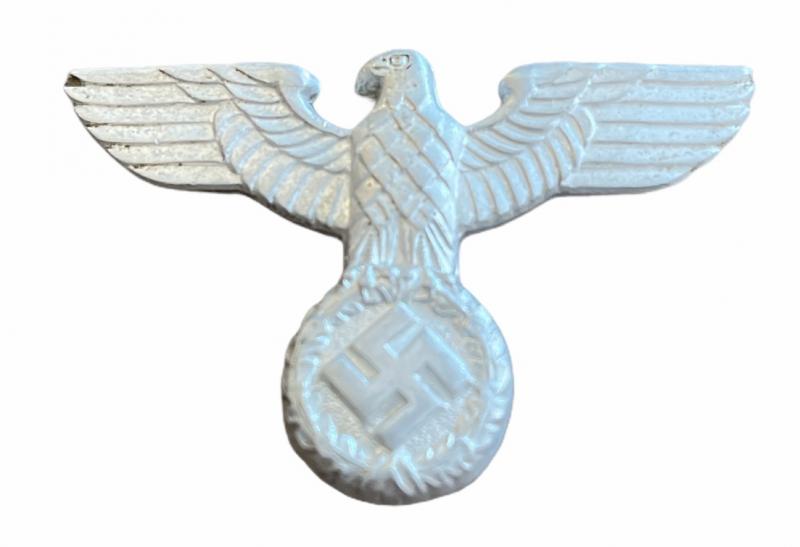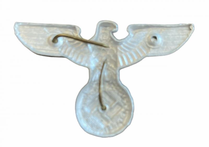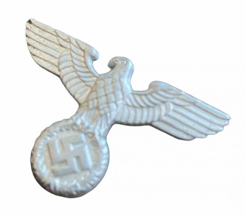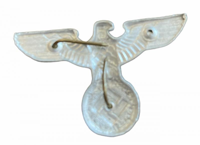 Third Reich Political cap Eagle Nice used Third Reich aluminum made political cap eagle. One prong missing, but still perfect to complete a nice political cap. In very good condition.