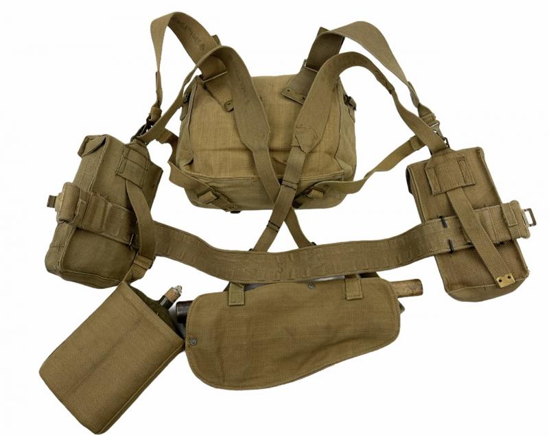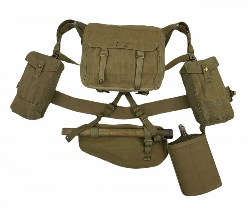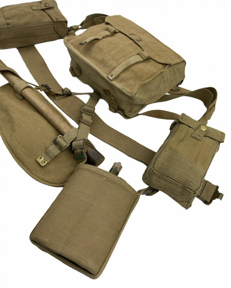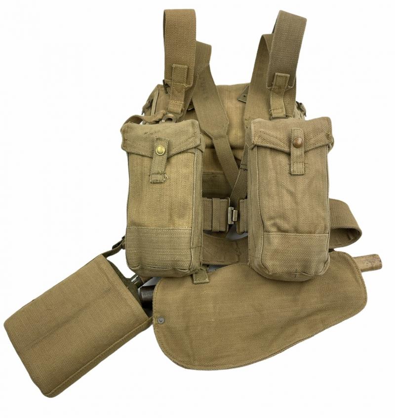 Britse WW2 economy model combat belt, Basic pouches, Shoulder straps, Trenchtool, Canteen and Small Pack with shoulder Straps.