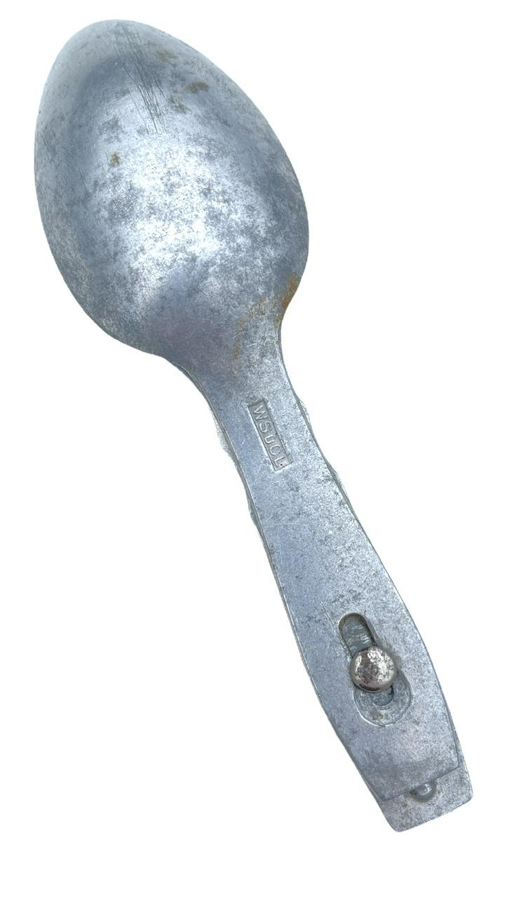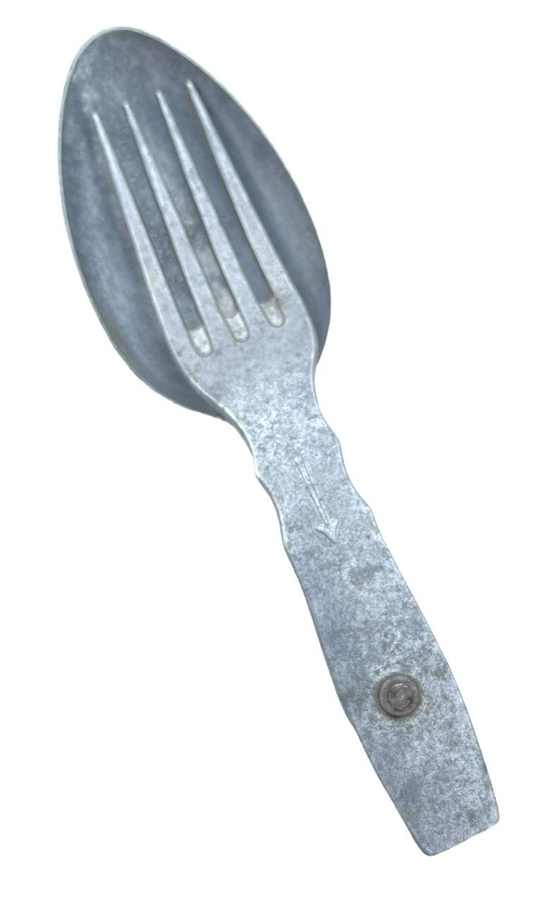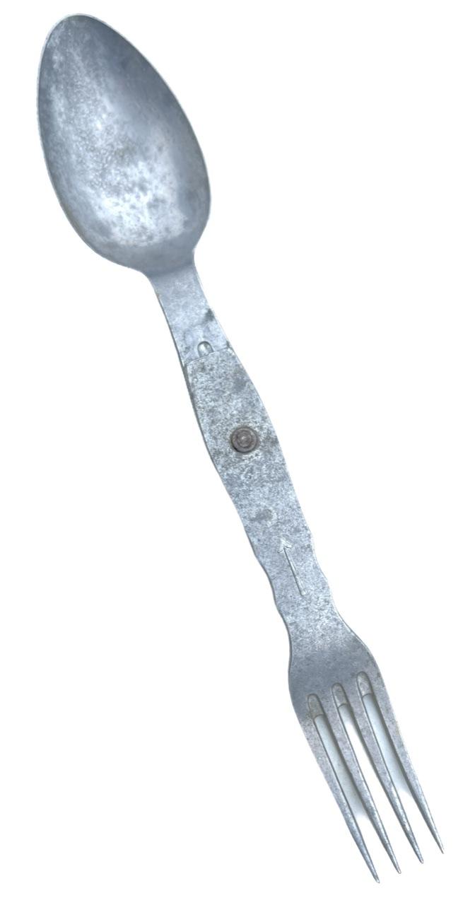 Wehrmacht Göffel (Cutterly set) Aluminum made Wehrmacht folding cutterly set So-called “Göffel” (Gabel und Löffel) fork and spoon combination. Maker marked “W.S.u.G.L.” In used but good condition