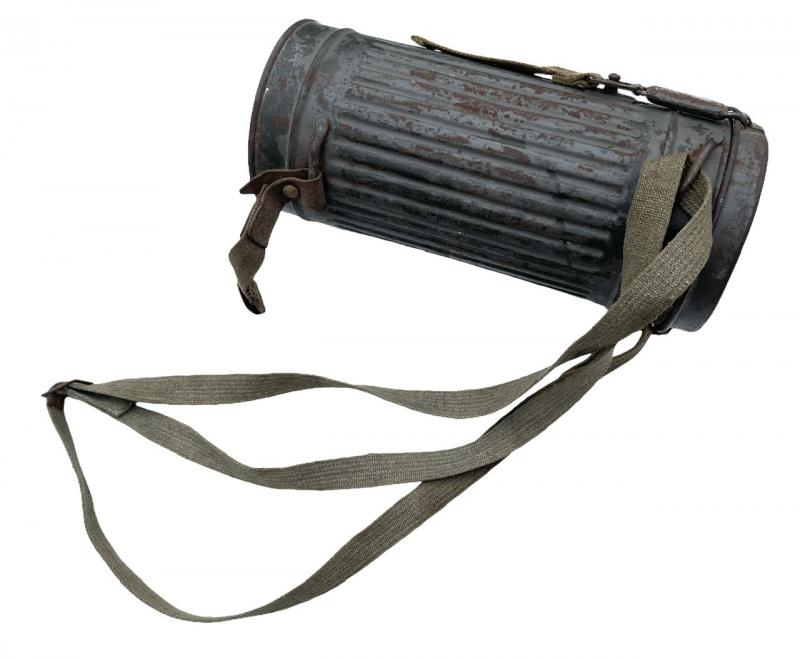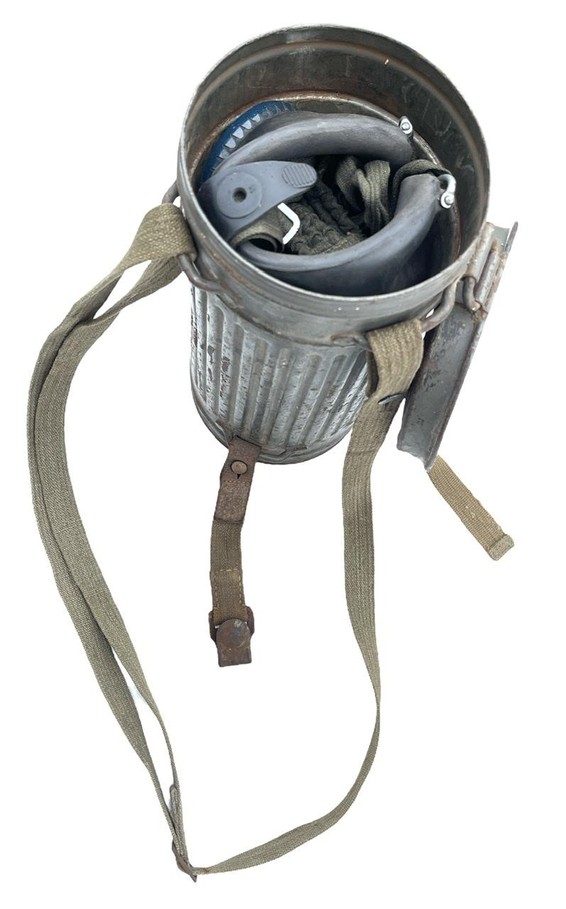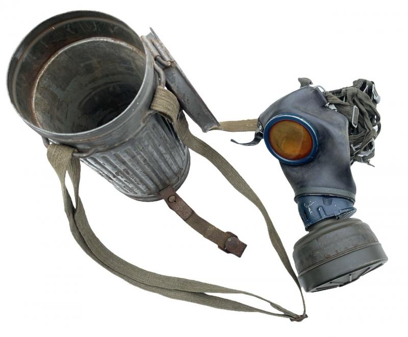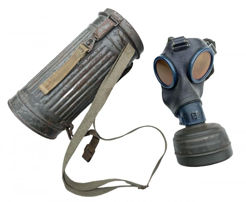 Nice used Wehrmacht/Kriegsmarine M31 gasmask cannister with gasmask, complete with all its original straps.