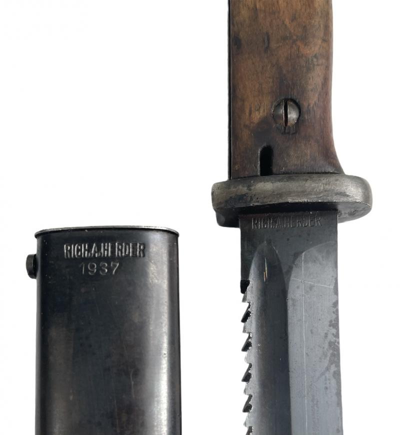 Extremely rare to find K98 bayonet with sawback and full matching numbers “7242” made by “Richard Herder” and early dated “1937” in used but very good condition. Fantastic for a bayonet collection!