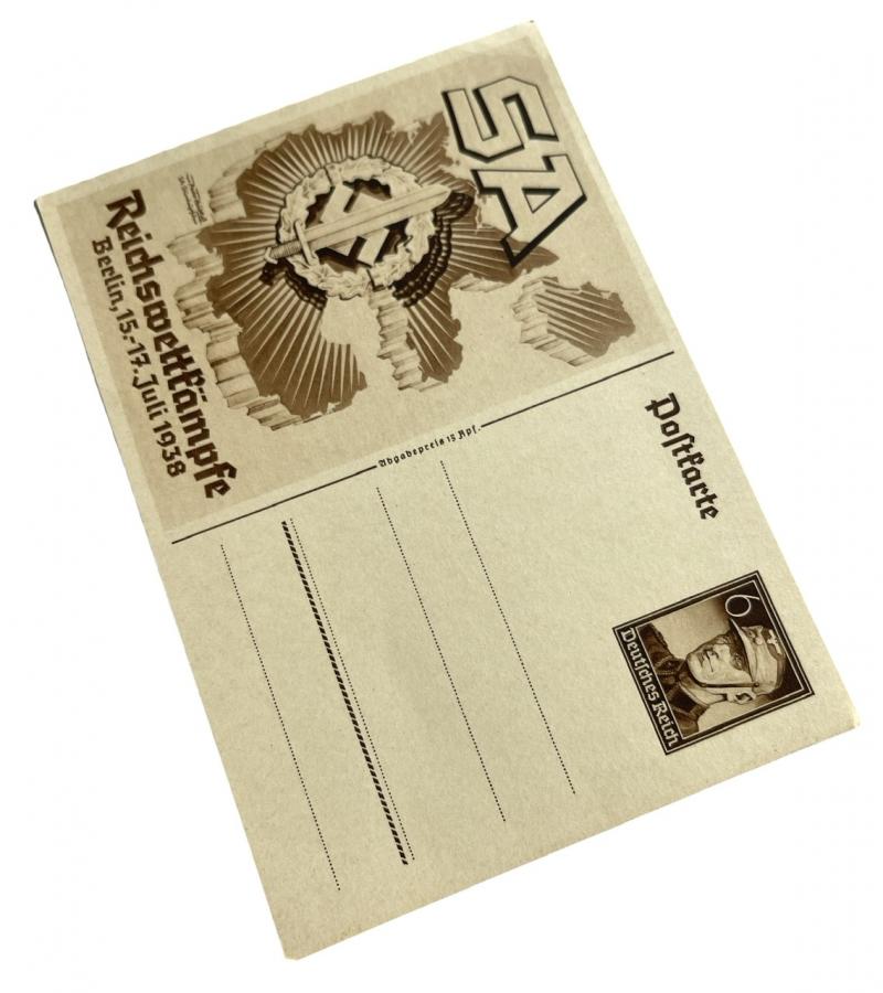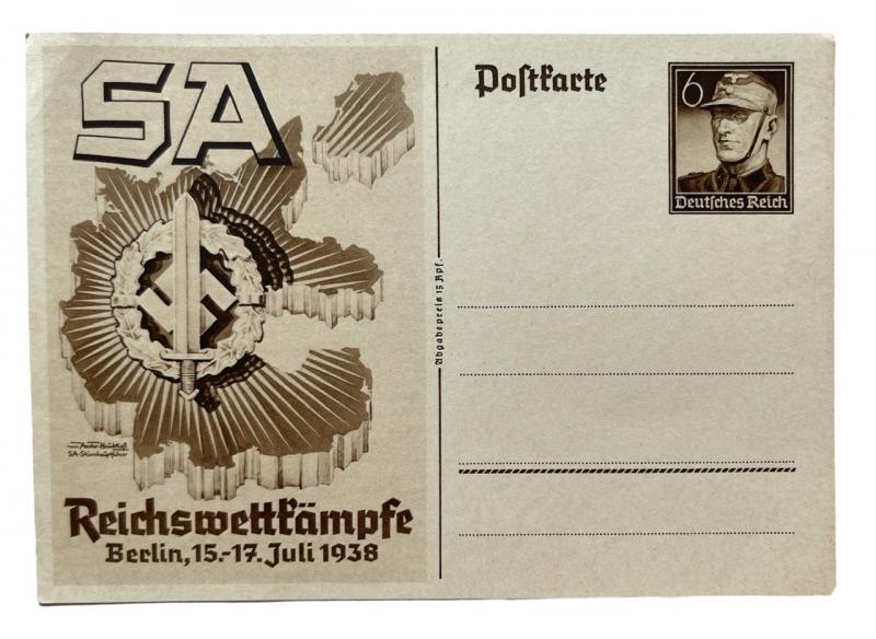 SA Postcard Nice early SA postcard “SA Reichswettkämpfe, Berlin 15-17 Juli 1938” Nice decorative postcard in very good condition.