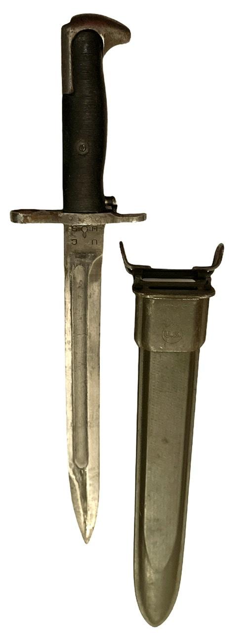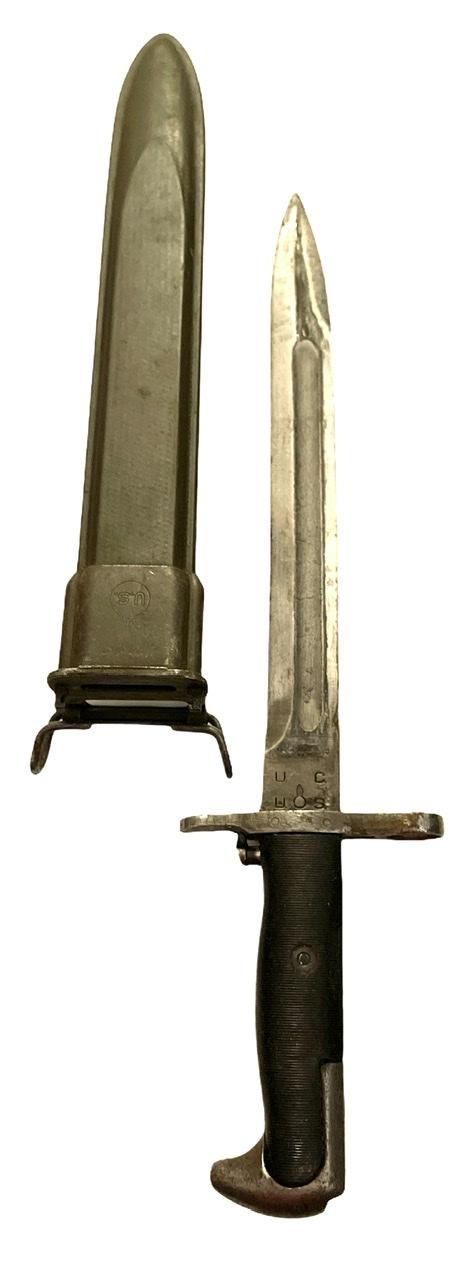 Very nice used US WW2 Garand bayonet in its original scabbard marked with the “flaming” bomb proof sign. The Bayonet is marked “U.C. U.S.” and also marked with the “flaming” bomb proof sign