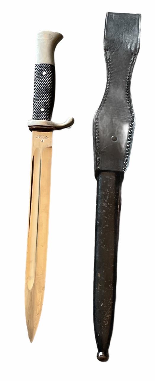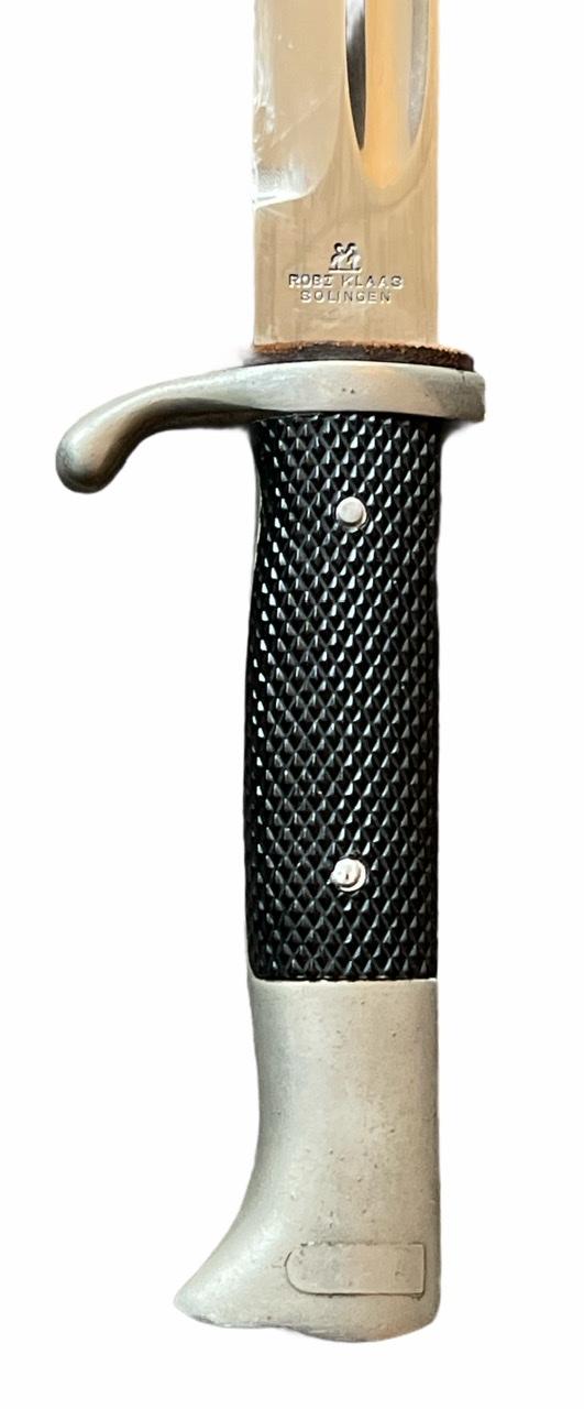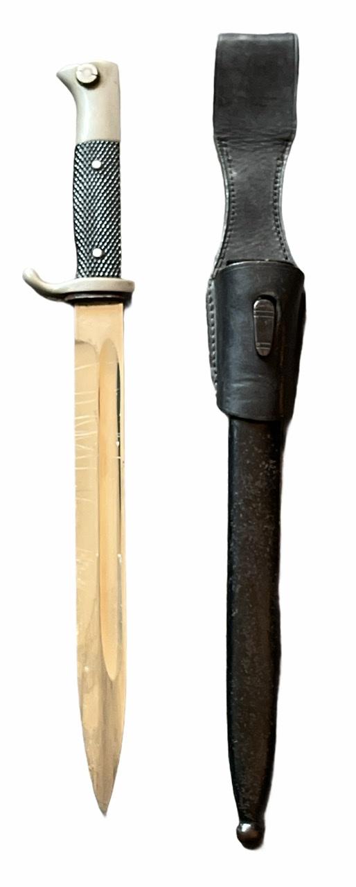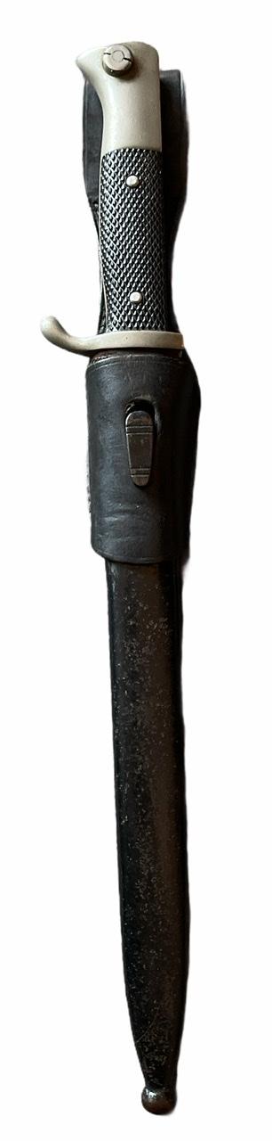 Nice used Wehrmacht “Artillery” (red felt in the riffle attachment part) in its original scabbard and with its nice leather dress frog. Overal an nice used but outstanding dress bayonet in great condition!