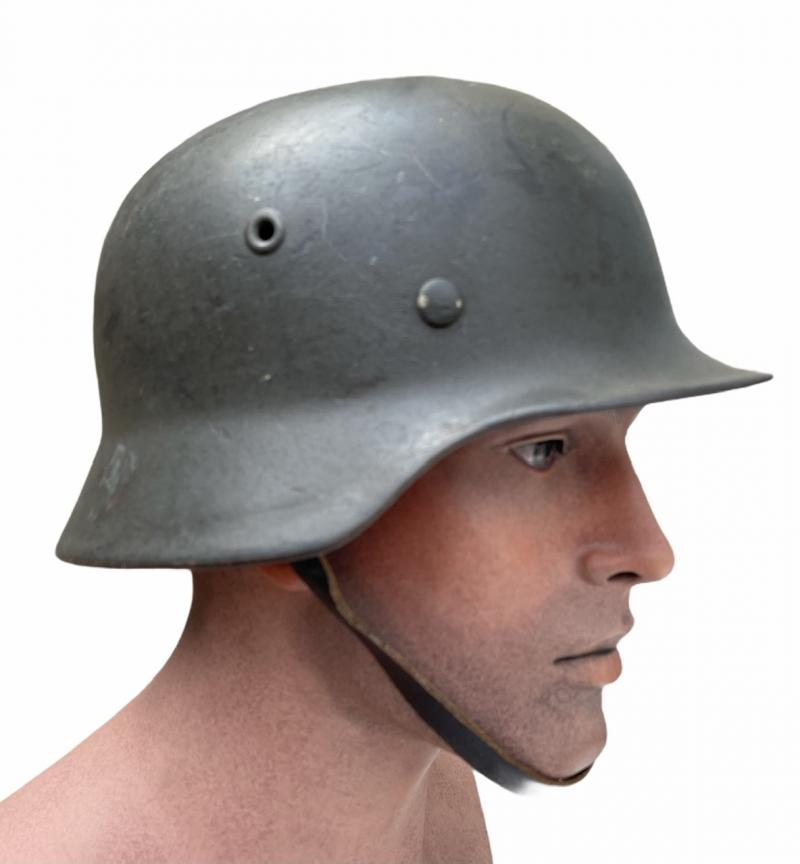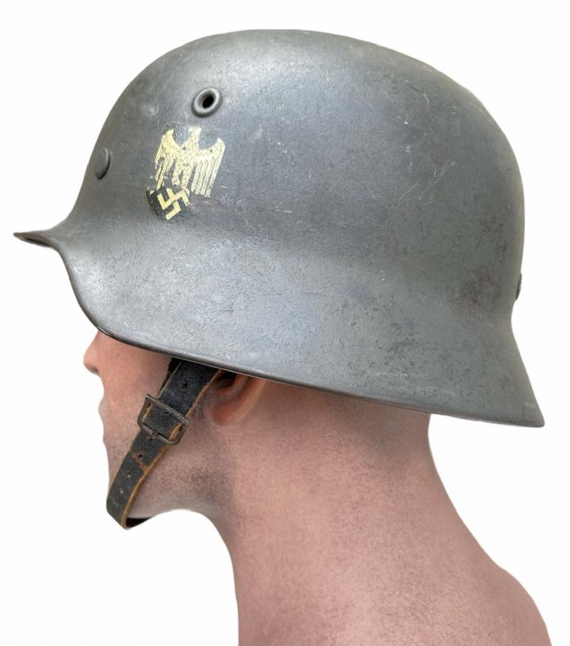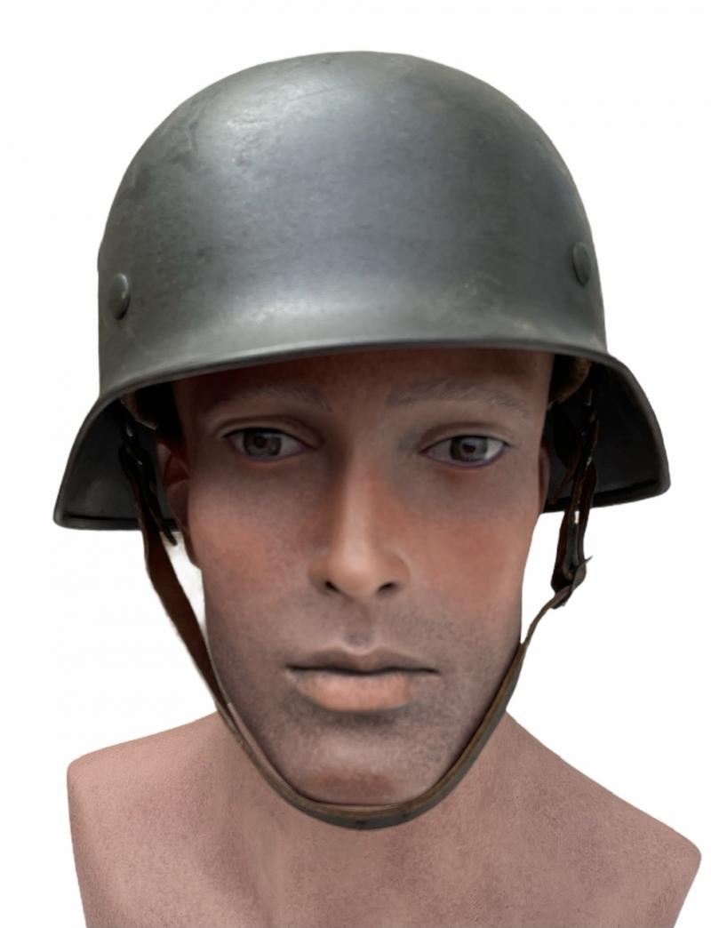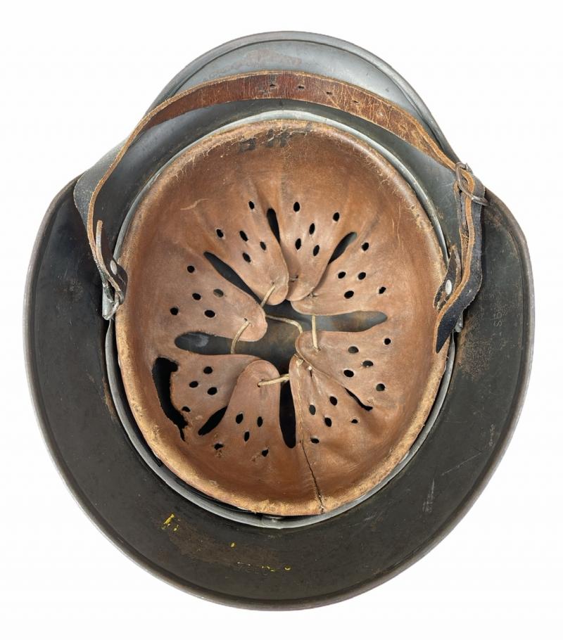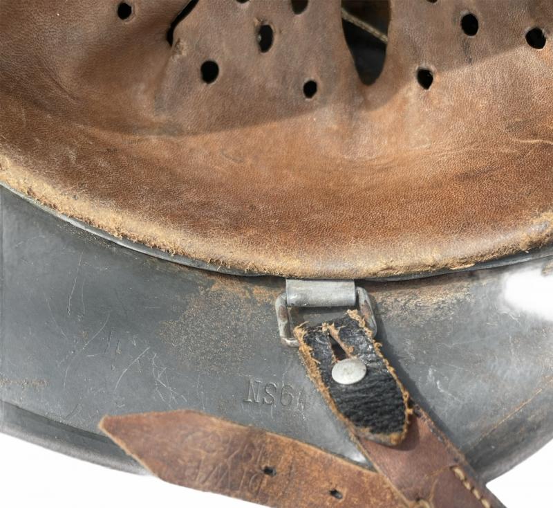 With its original liner string. The leather combat helmet strap is nicely maker code marked and dated “1943” overal a very nice Wehrmacht M40 SD combat helmet in used but very good condition and these are getting harder to find these days!