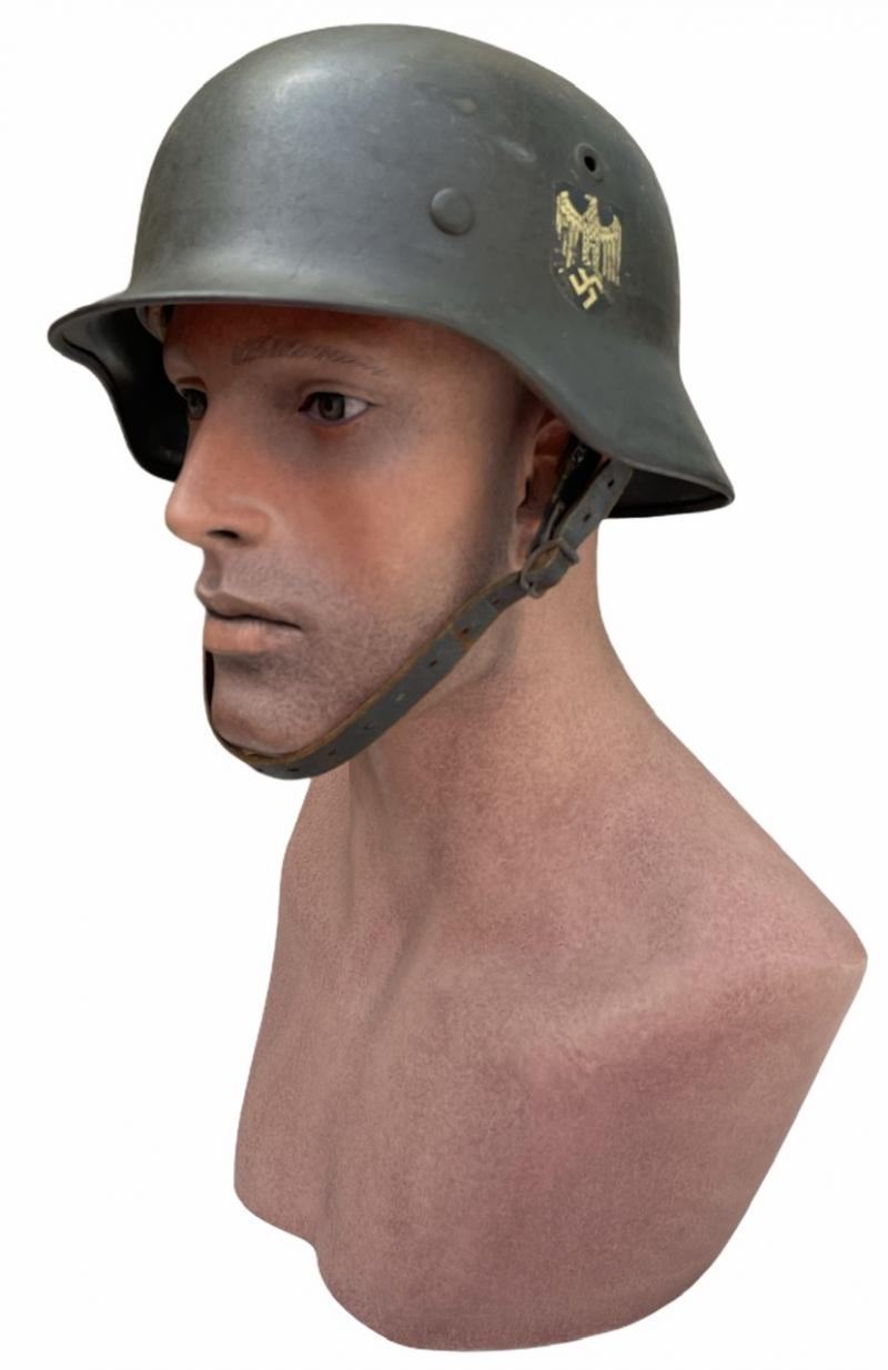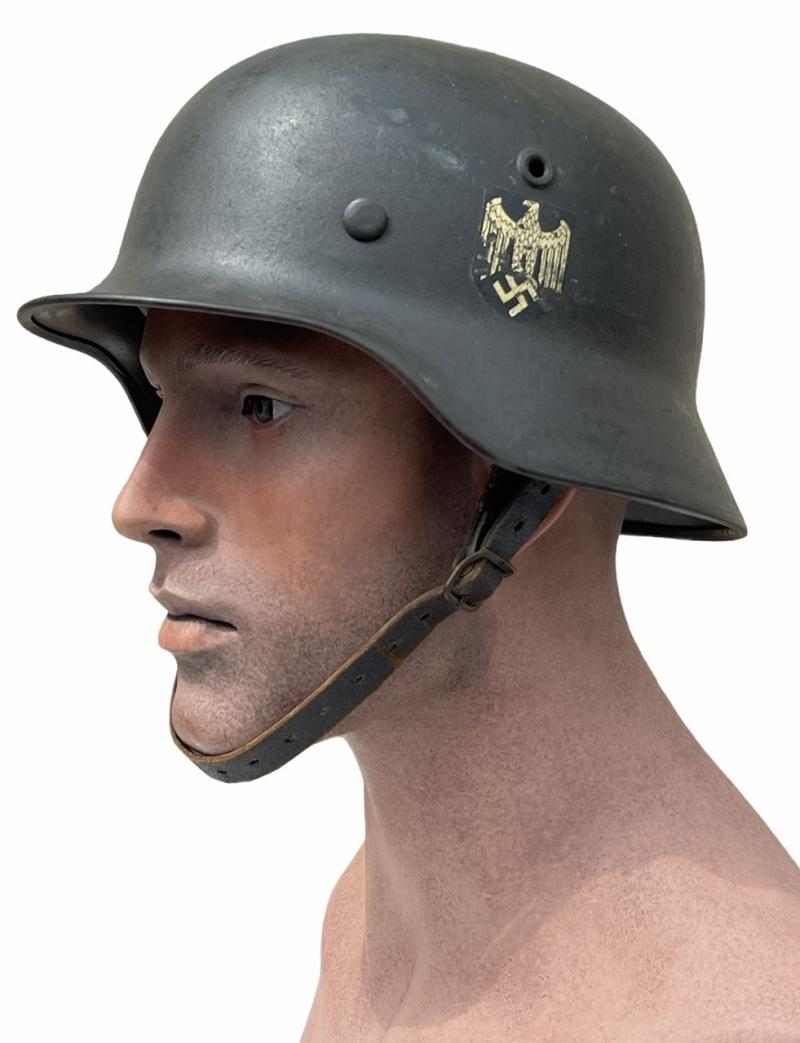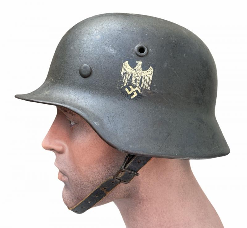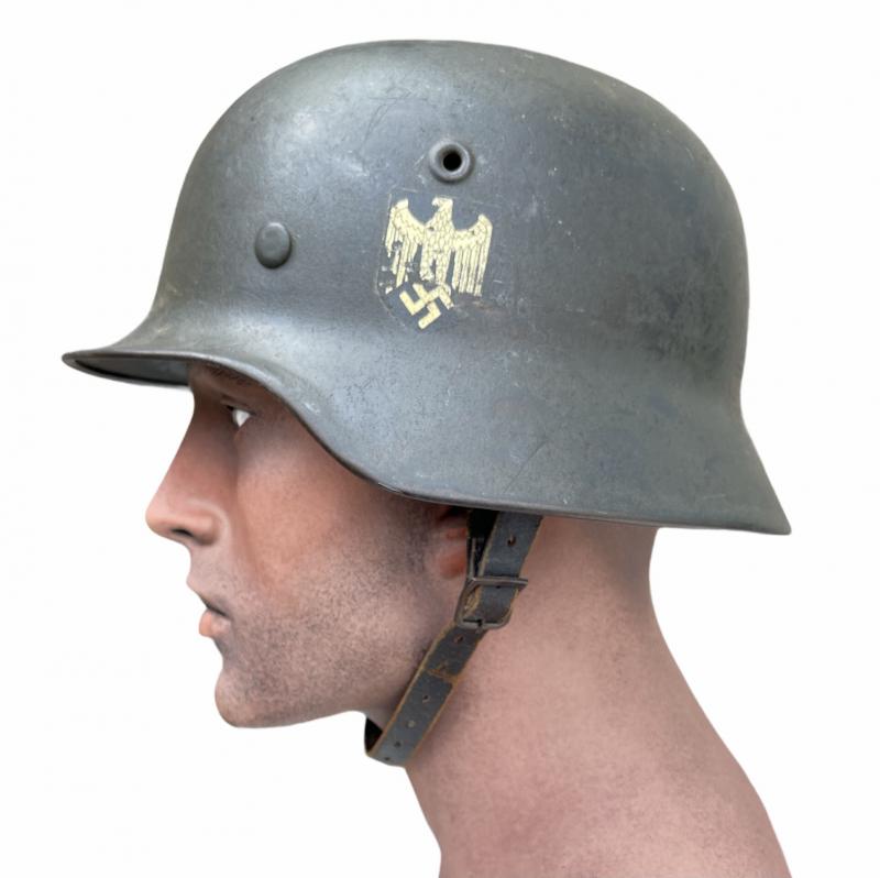 With its original liner string. The leather combat helmet strap is nicely maker code marked and dated “1943” overal a very nice Wehrmacht M40 SD combat helmet in used but very good condition and these are getting harder to find these days!