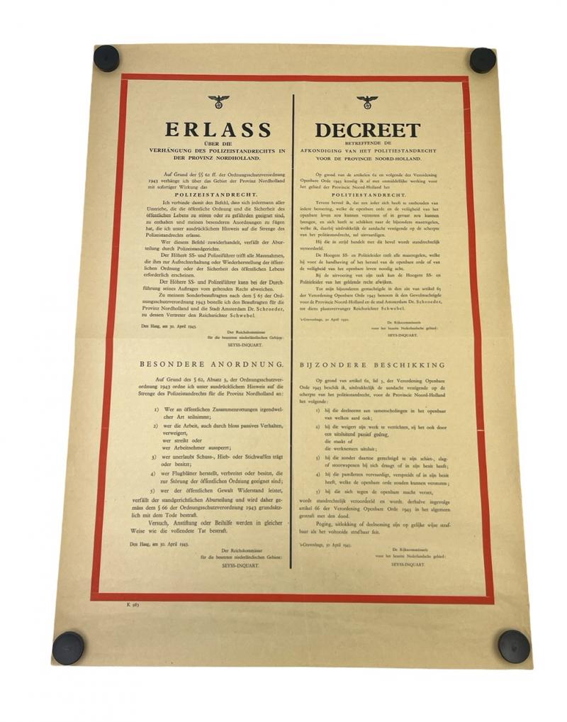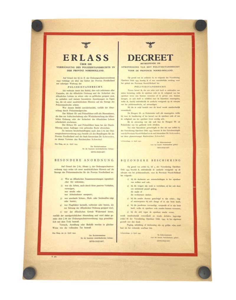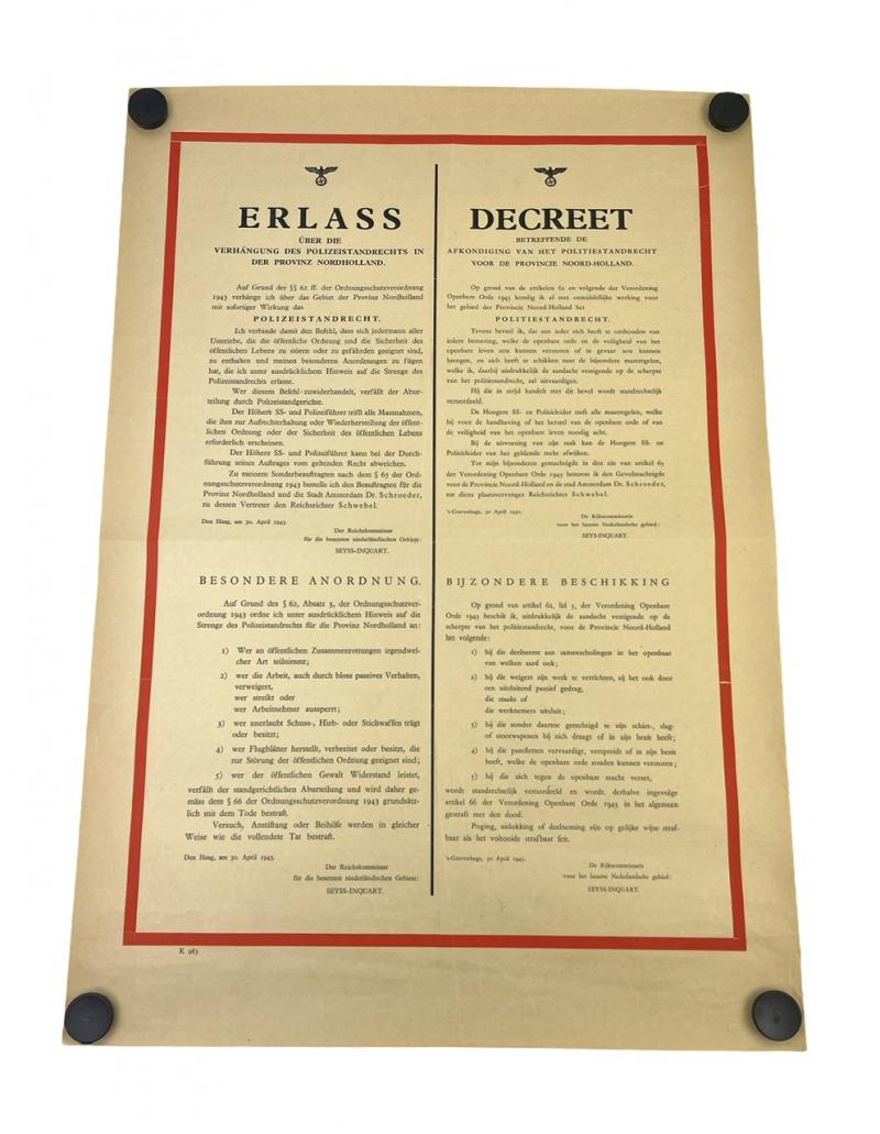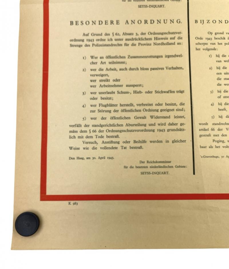 Signed by “Der Reichskommissar Bezetzten Niederländische Gebiete, Seyss Inquart” and dated April 1 “1943” Overal a very nice announcement poster in very good condition! Great for display!