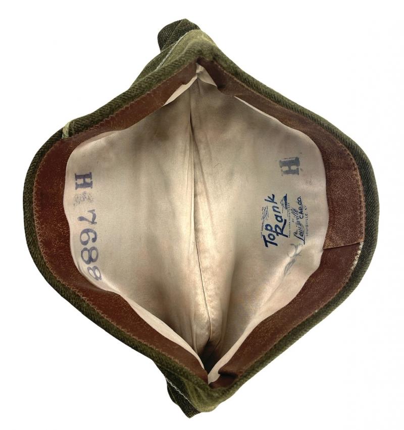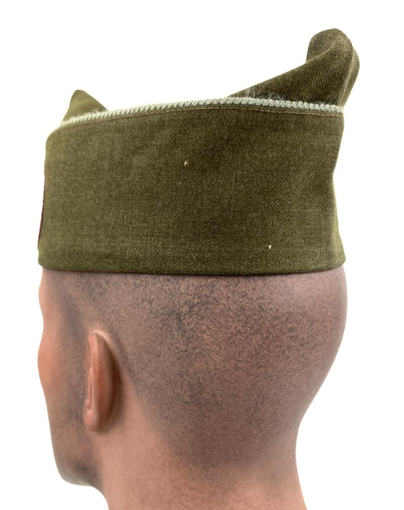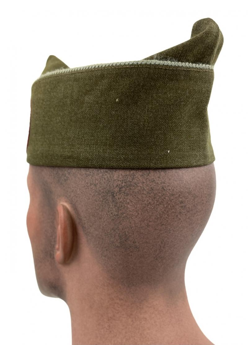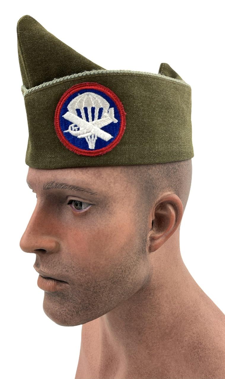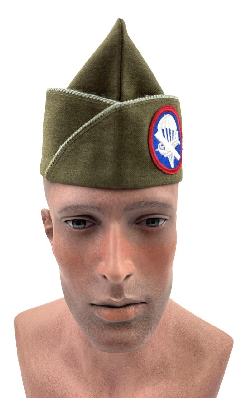 Very nice US WW2 “Airborne” so-called “Garrison” cap for Paratroopers and Gliderborne enlisted soldiers. Maker marked and marked with owners loundry number and complete with original sewed nice “Airborne” patch.