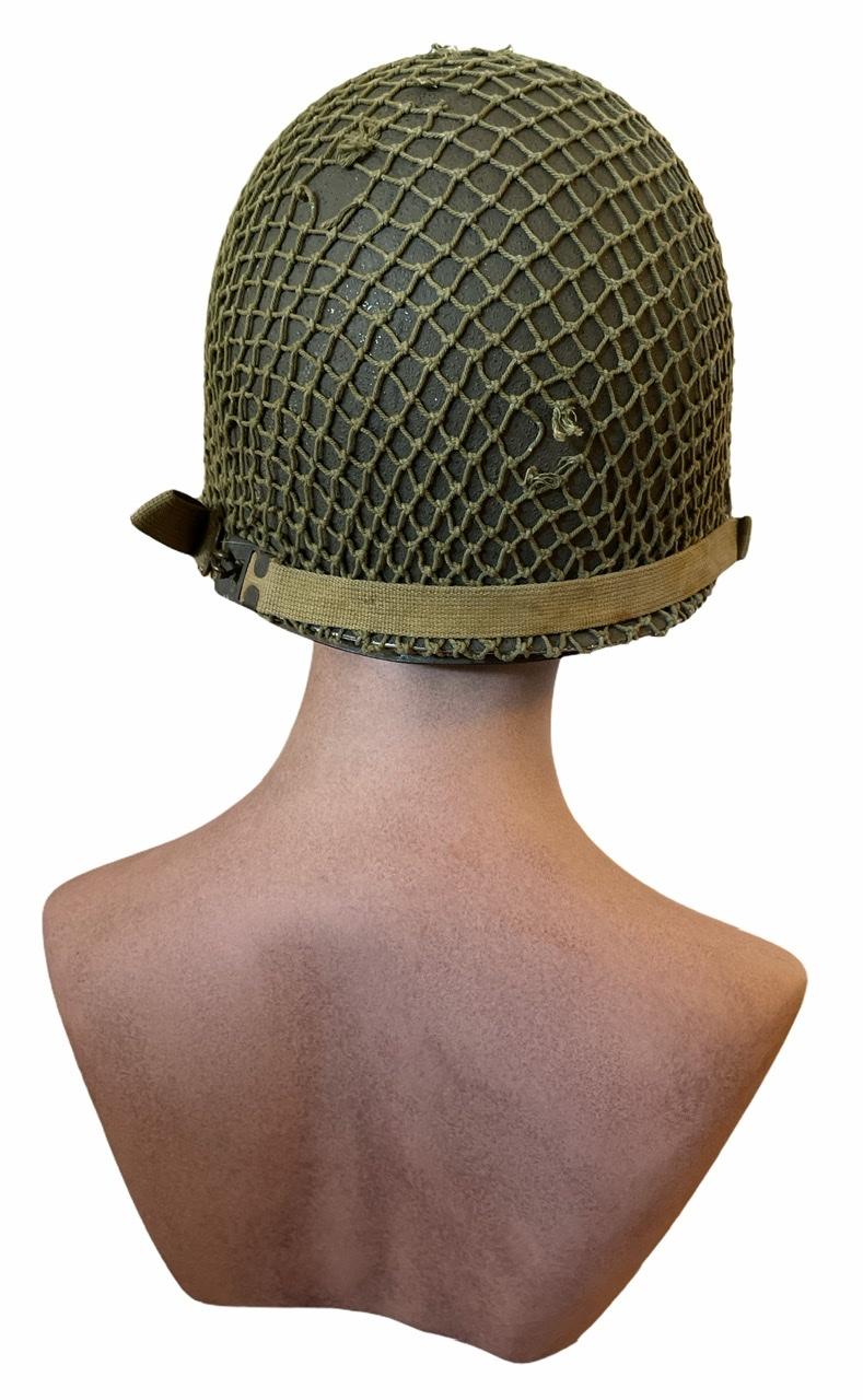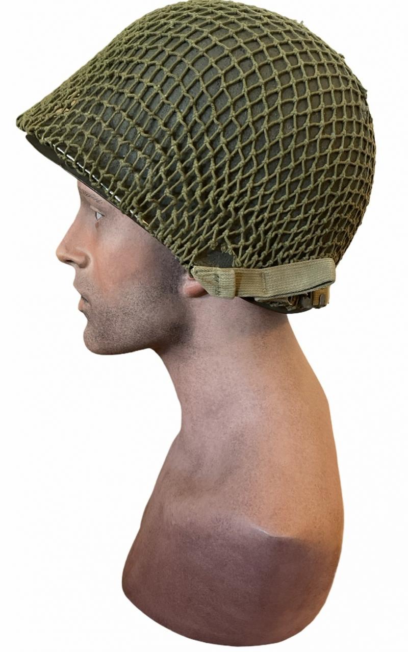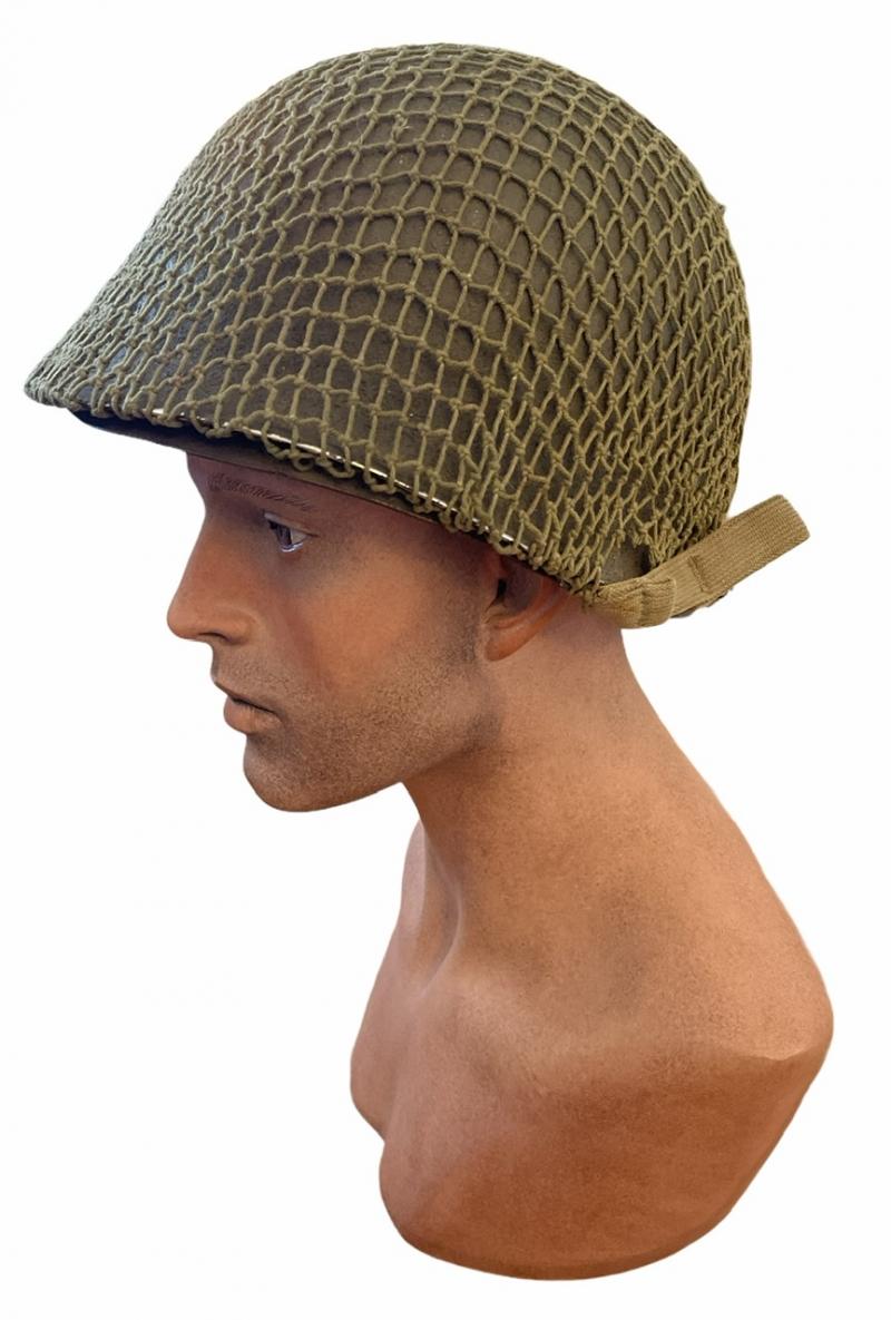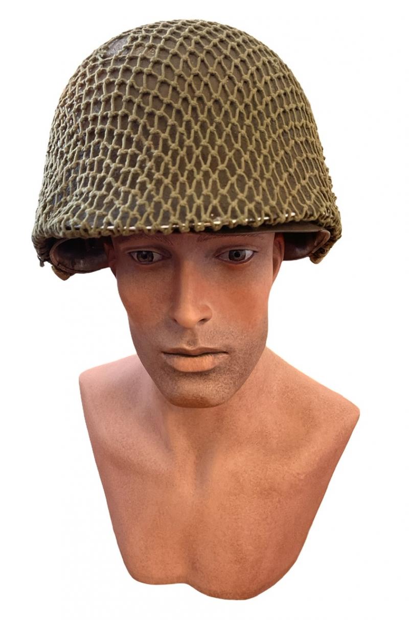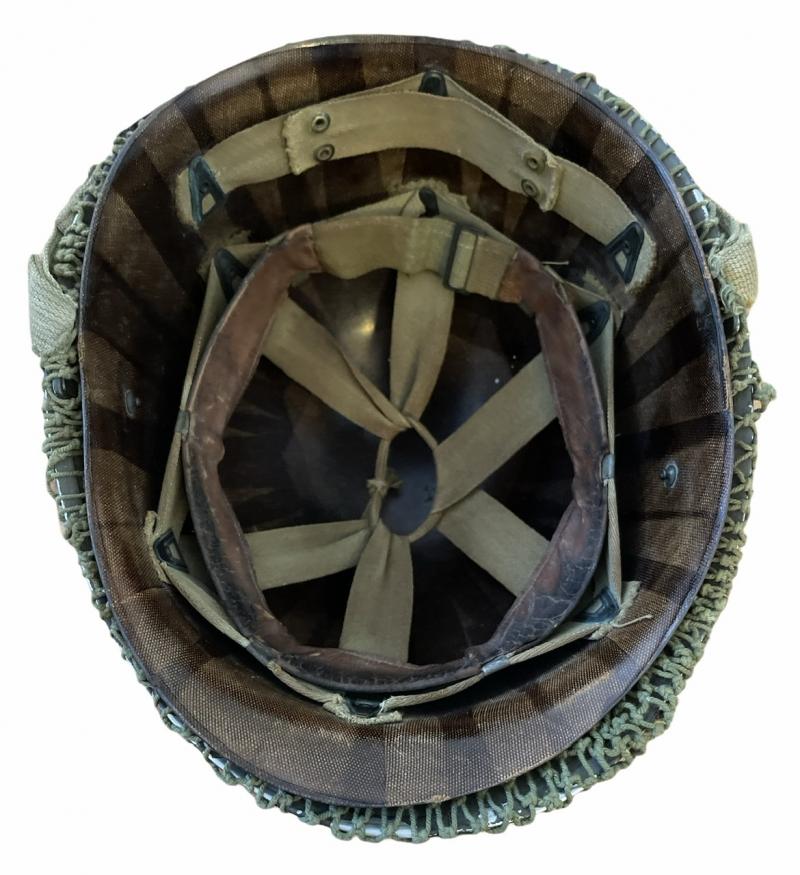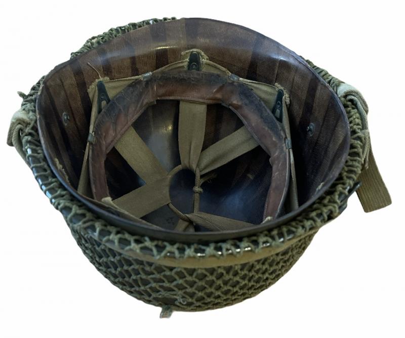 Used but fabulous US WW2 fixedbail helmet with British helmet net and its original liner