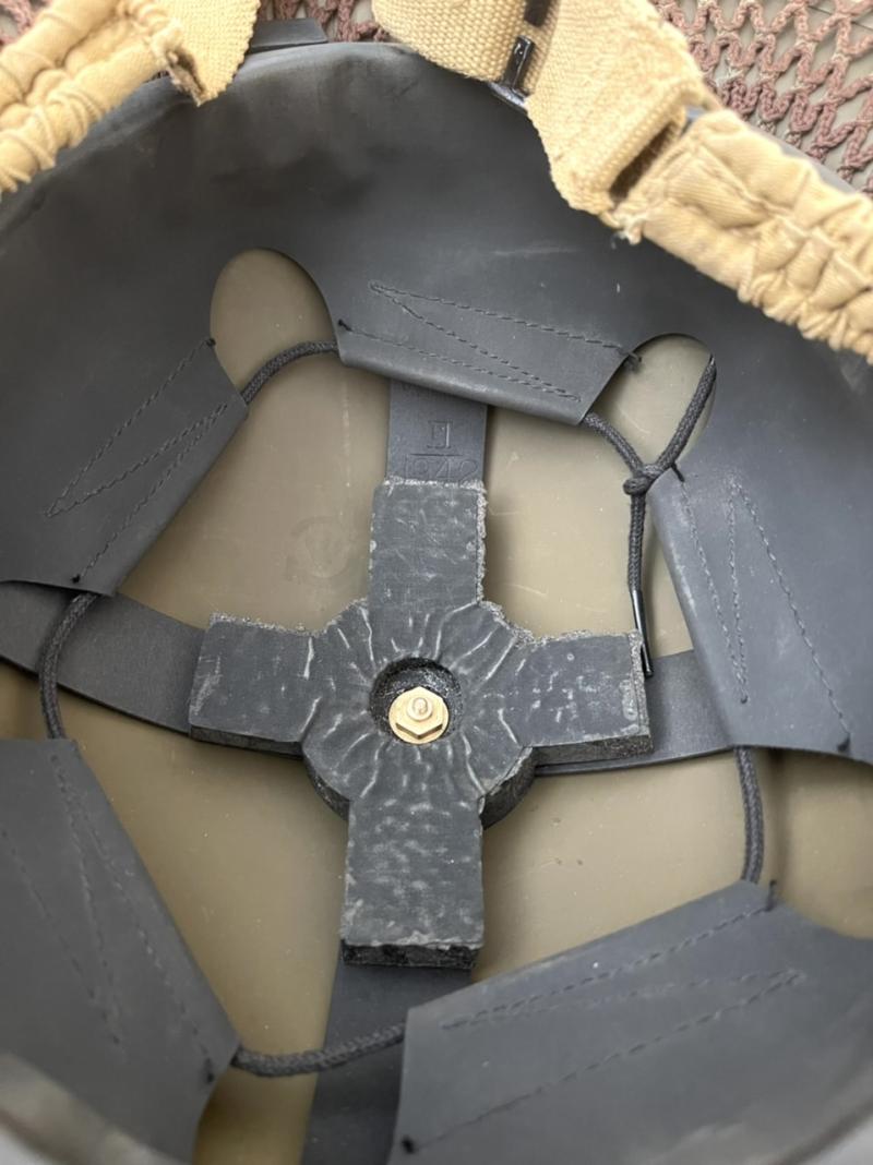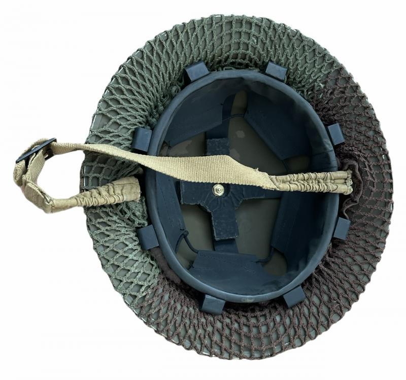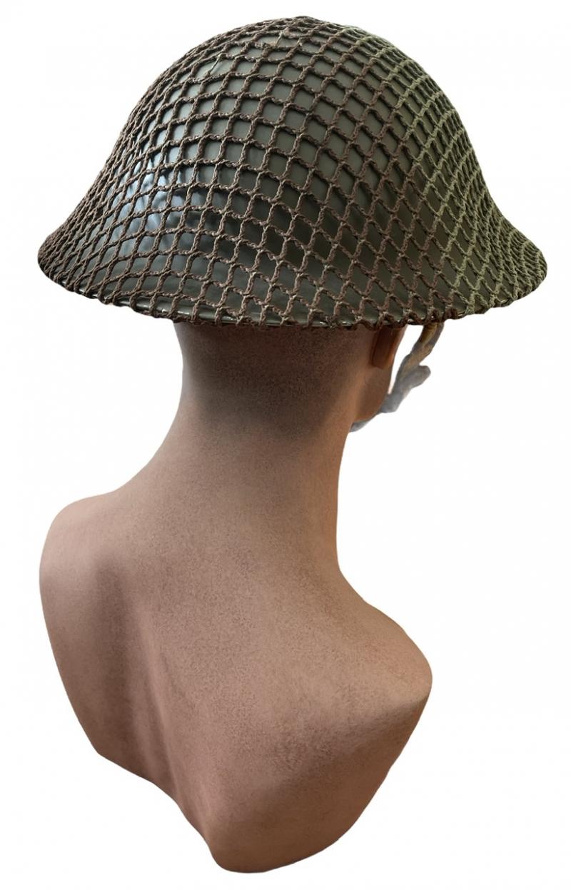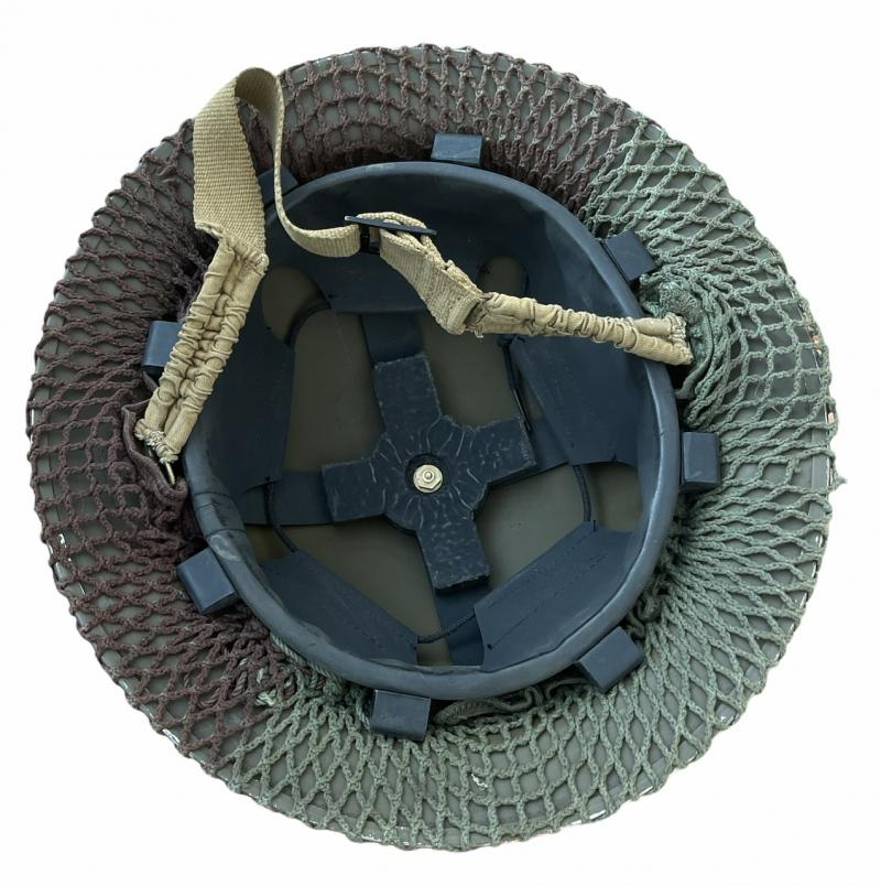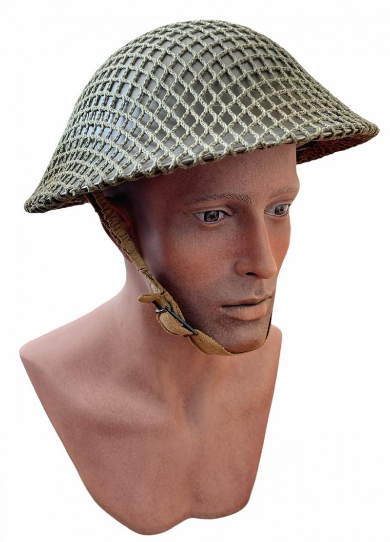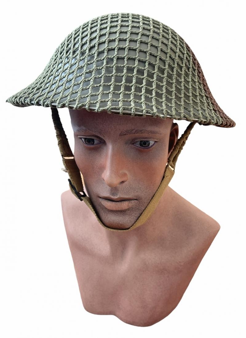 Mint Canadian “Brodie” helmet in 100% if its original olive drap camo pant, mint liner and combat helmet strap dated “1942”. With its original 1e type Canadian helmet two tone camo net.