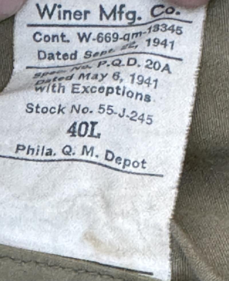 With Oilcloth label in the pockets. Dated “September 22, 1941”