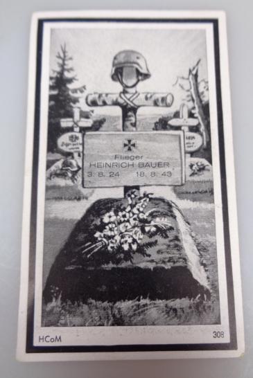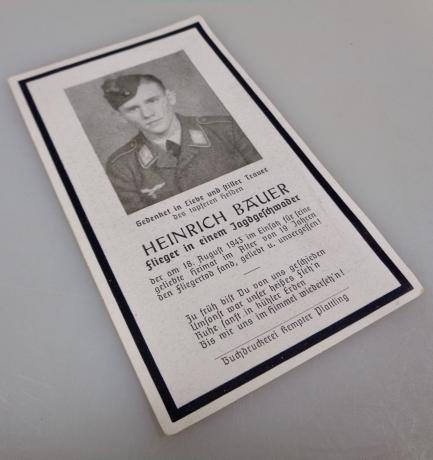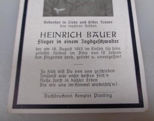 Luftwaffe Fighter Pilot Death Notice KIA August 18, 1943 "Heinrich Bauer" at the age of 19 years "Flieger in einem Jagdgeschwader" Fighter Pilot. In very good condition.