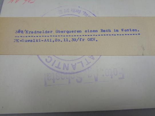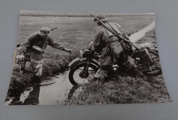 Press Photograph Wehrmacht Kradmelder Very nice press photograph of Wehrmacht Kradmelder (Motorcycle Dispatch rider) crossing a small river. In very good condition.