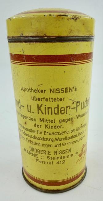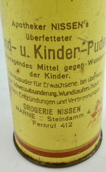 Third Reich era Wound & Child Powder Medical powder used for “Transpiration, Sore Run, Inflammation, Burns and Soreness” Nice decorative metal can with content. In very good condition.