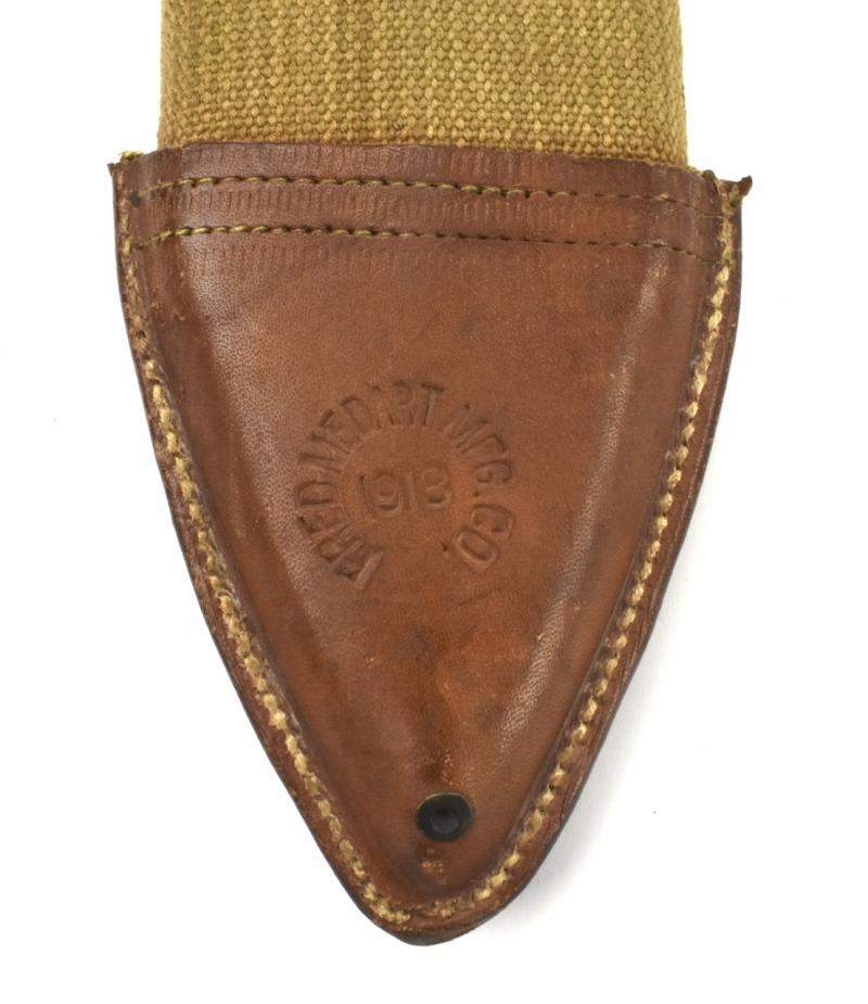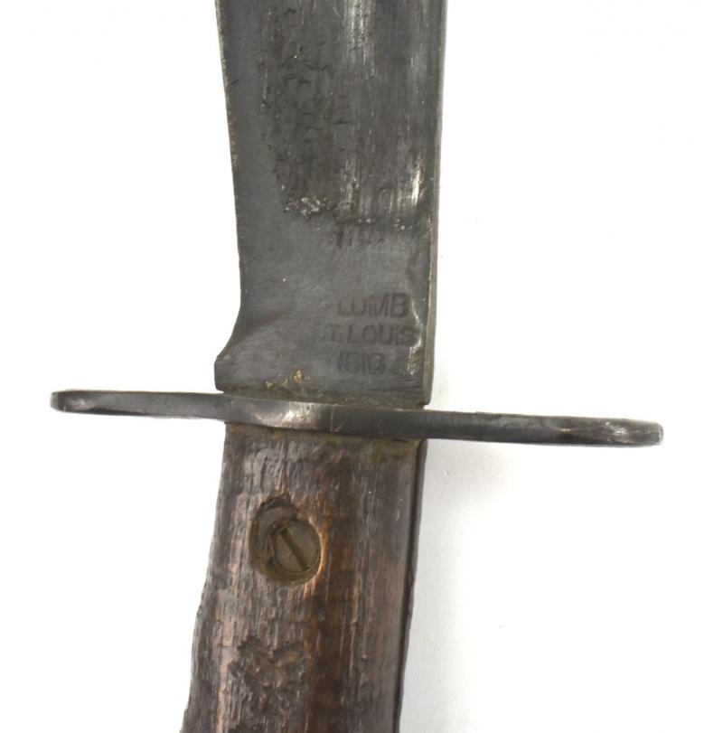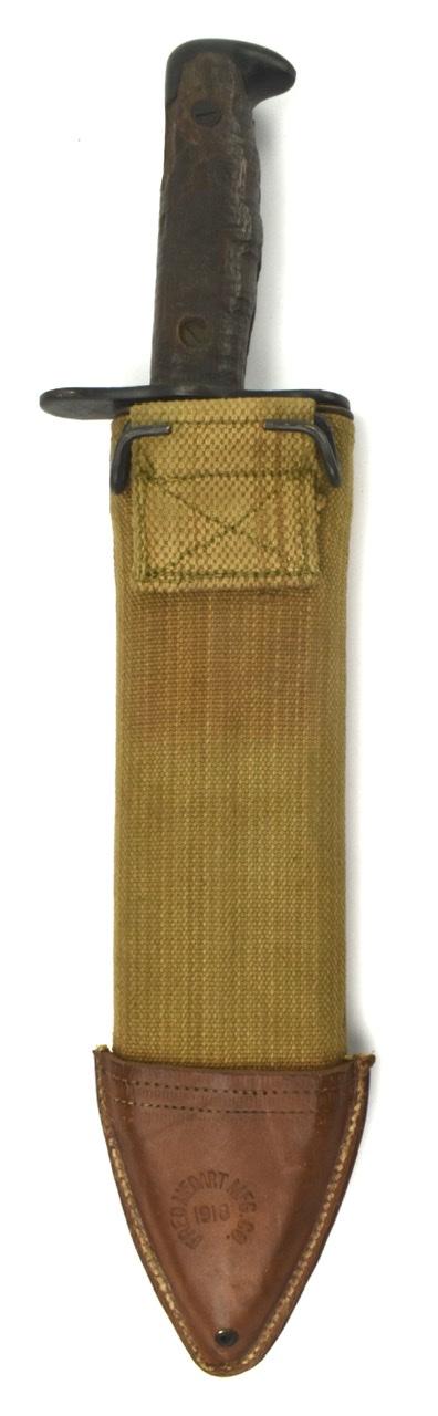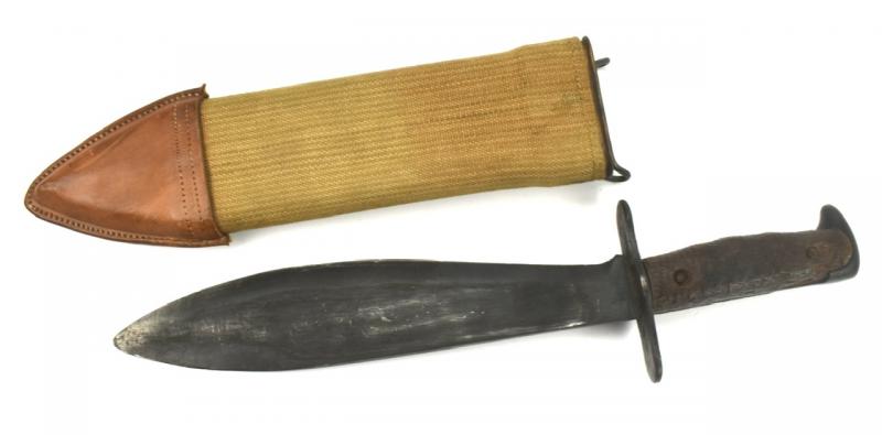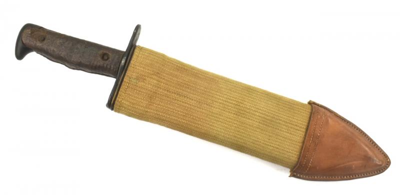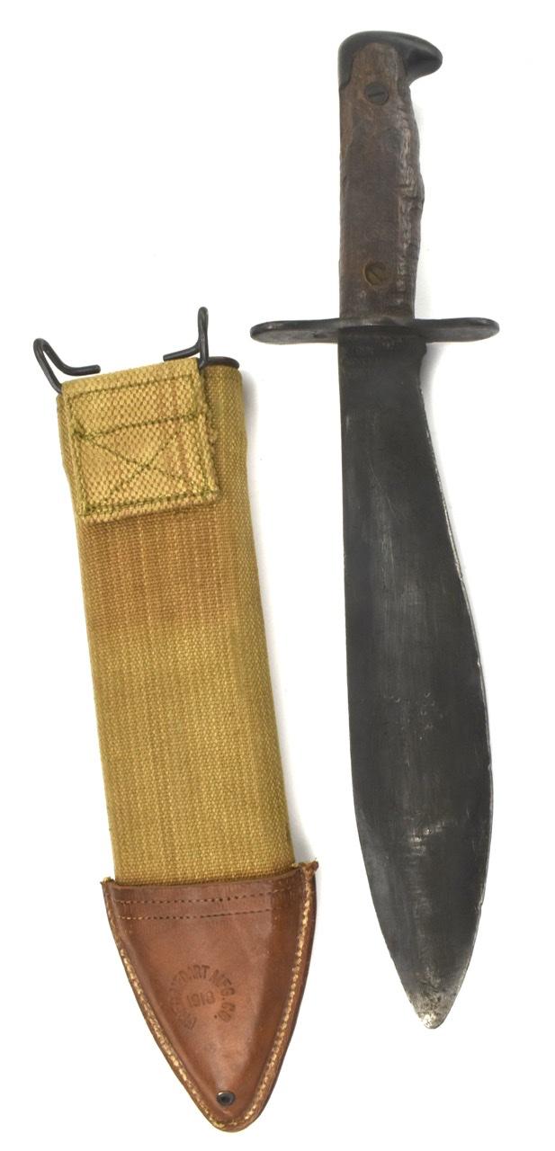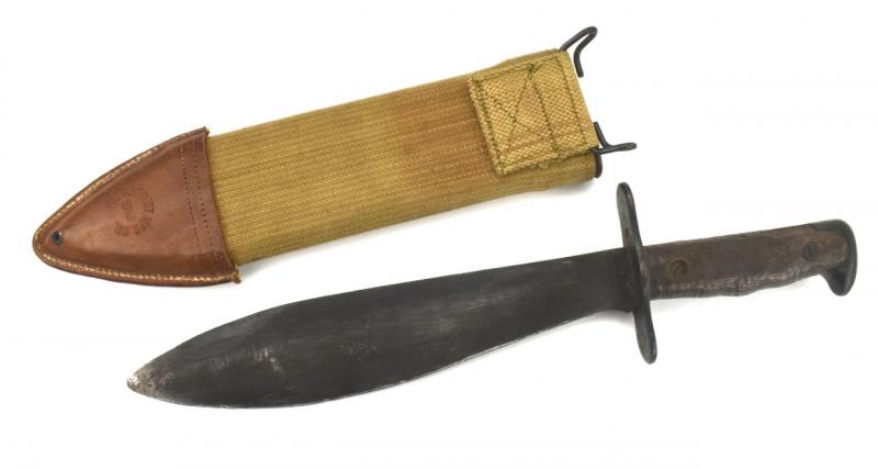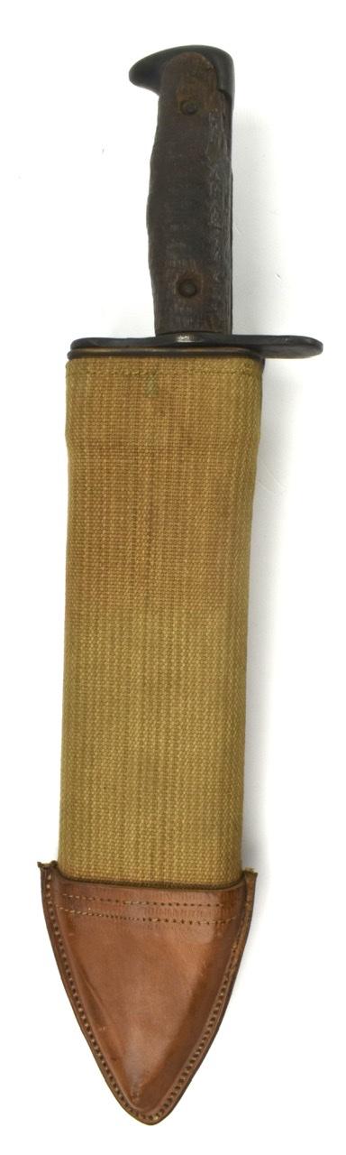 Very nice US WW1 bolo knife made by “Plumb, St. Louis” dated “1918” the nice webbing/leather made scabbard maker marked “Fred Medart MFG Co. and dated “1918” aswell. Overal a very nice Bolo knife in very good condition. Nice for a WW1 and WW2 collection.