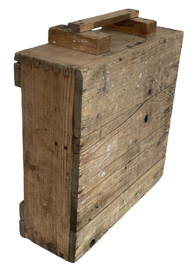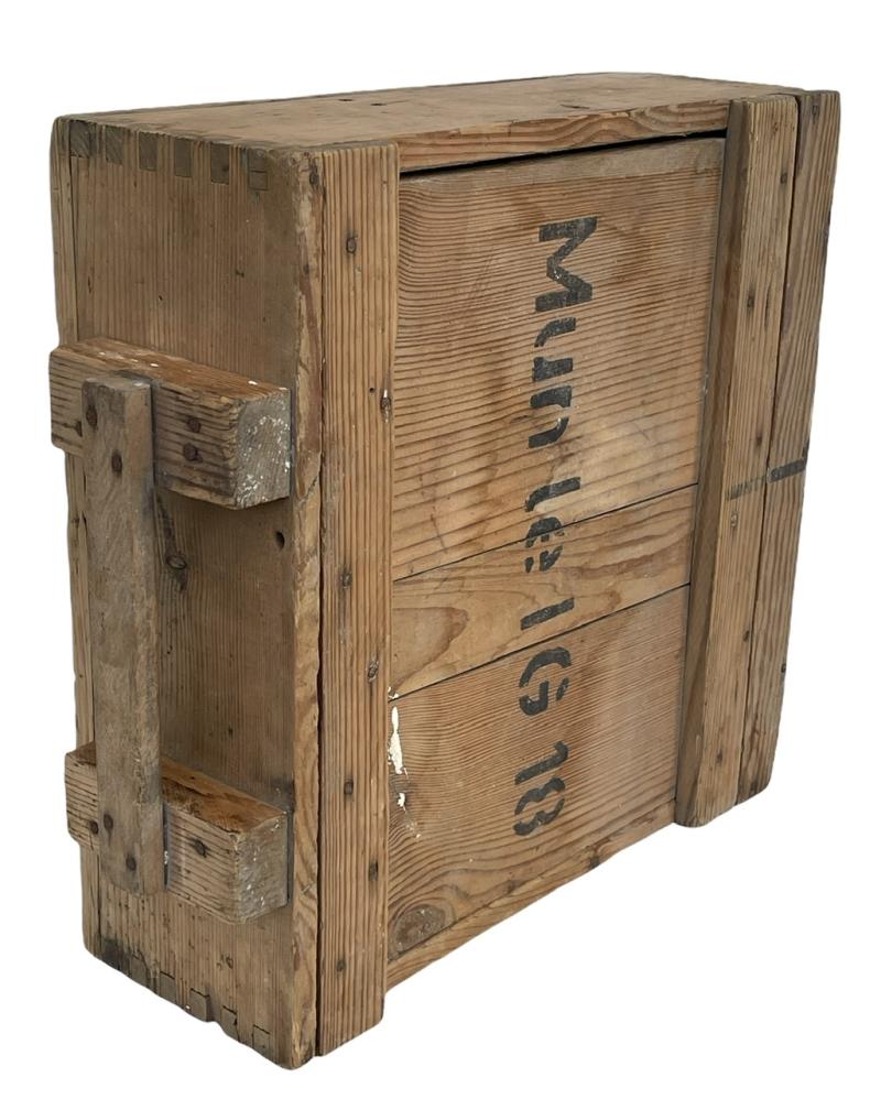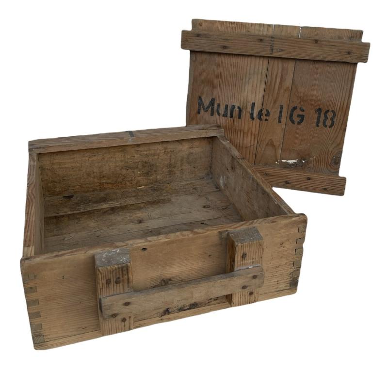 “Leichte Infanterie Geschutz 18” very nice used wooden Wehrmacht ammunition case for 3 grenades with there kartoes. Case has its original text overal a very nice wooden Wehrmacht ammunition case in used but good condition. Great for display!